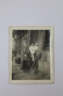 학익동 흥한방직 일본사택집에서 찍은 사진이다. 한재희님이 태어나기 전에 촬영한 사진이다. [아버지가 흥한방직 계장이셨던 시절에 일본 사택을 사서 신혼을 보내셨던 우리 4형제의 어린시절의 집이다. 수도국산에 사시는 지인을 만나러 가는 외출 준비를 마치고 다다미거실 툇마루 앞에서 한컷 찍으시고 가셨다고 한다.] 큰 오빠가 3살쯤, 작은오빠 1살쯤 나이라고 한다.