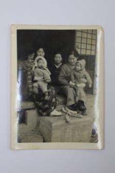 흥한방직 일본사택 다다미방 툇마루에서 촬영한 사진이다. [엄마가 집에 놀러온 이모와 함께 이웃에 사는 애기 엄마들과 즐거운 시간을 보내고 있는 모습.] 발받침 돌이 배의 닻을 묶을 때 사용했던 돌. 물이 인근까지 들어왔었다는 증거.