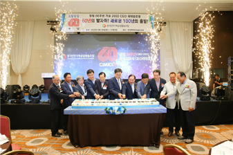경기 연천군 백학자유로리조트에서 열린 경기인천기계공업협동조합 창립60주년 기념식에서 임직원들과 내빈들이 함께 축하 케이크를 커팅하고 있다. * 촬영일자 : 2022년 * 사진크기 : 499x333 * 사진장수 : 1장