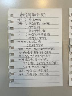 지무환(전 한국유리 근로자)의 1차 인터뷰 중 구술자가 준비한 메모를 찍은 사진이다. 2025년 10월 14일에 진행된 면담의 면담자는 지역 기록자 곽은비이며 제물포역 지하도상가 열린공간1에서 진행되었다. 메모에는 한국유리 학익동 창고 관련 개요, 쓰임, 근무 관련한 사항이 적혀있다. 2025년 진행된 ‘옛)동양제철화학과 학익동, 용현동 일대의 변화’ 기록 과정의 일환으로 진행된 인터뷰이다. • 촬영장소: 제물포역 지하도상가 열린공간1 • 촬영일자: 2025년 10월 14일 • 사진크기: 가로) 3024x4032 • 사진장수: 3장