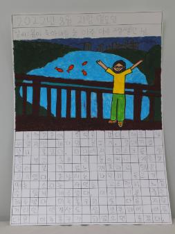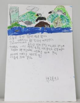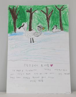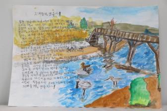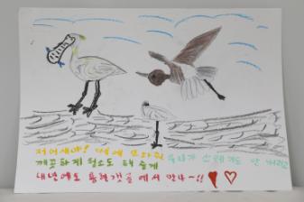 쌍안경으로 물오리, 중대백로, 청다리도요, 흰뺨검둥오리, 저어새 등을 보았던 모습을 그림으로 그렸다. 이 그림은 제3회 학산백일장 '사람과 자연이 함께하는 생태적 삶을 꿈꾸며'에서 학익유수지(학익용현갯골)을 다녀와 그린 이다연의 '쌍안경으로 바라본 갯골의 새들' 그림일기이며, 초등부 부문 은상을 수상한 작품이다. • 생산장소 : 인천광역시 미추홀구 • 그림개수 : 1점 • 그림크기 : 8절지 • 관련파일(비공개) 1. 응시표