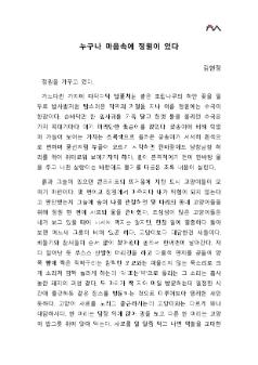 나만의 정원을 가꾸며 느낀 생각과 마음들을 적은 내용이다. 이 수필은 제2회 학산백일장 '미추홀, 삶을 위로하다'에서 내게 위로가 되는 것들이라는 주제로 쓴 김현정의 '누구나 마음속에 정원이 있다' 이며, 일반부 부문 은상을 수상한 작품이다. • 생산장소 : 인천광역시 미추홀구 • 쪽수 : 5쪽 • 크기 : 163KB • 관련파일(비공개) 1) 응시표 및 글 원본