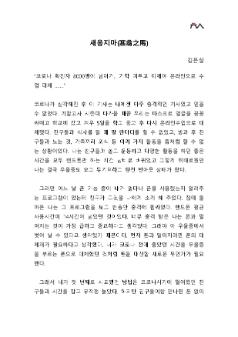 코로나로 우울증이 찾아왔을 때 극복하기 위해 책을 읽고 미라클모닝을 시작하여 다양한 것들을 얻고 우울증에 벗어난 내용이다. 이 그림은 제2회 학산백일장 '미추홀, 삶을 위로하다'에서 내게 위로가 되는 것들이라는 주제로 쓴 김은실의 '새옹지마' 수필이며, 청소년부 부문 동상을 수상한 작품이다. • 생산장소 : 인천광역시 미추홀구 • 쪽수 : 4쪽 • 크기 : 133KB • 관련파일(비공개) 1) 응시표 및 글 원본
