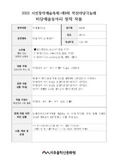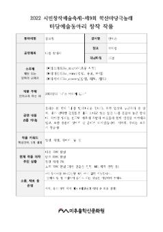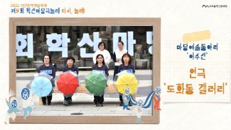 2022 시민창작예술축제 제9회 학산마당극놀래 '다시,놀래' 2022 어수선 마당예술동아리 공동창작 작품 영상이다. -축제일시 : 2022년 10월 15일(토) 오후 3시~20시 -공연장소 : 수봉공원 인공폭포앞 특설무대 -작품명 : 도화동 갤러리 -장 르 : 연극 -소 개 : 곧 사라질 우리네 집. 우리네 삶터 도화동. 마을에 터를 잡고 살아가는 사람들에게 집이란 어떤 의미인가? 사라져가는 집들이 들려주는 이야기를 담은 연극 -강사 오지나 -출연 조현경, 김명순, 김성형, 김태은, 김행화, 조형란, 황순녀