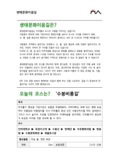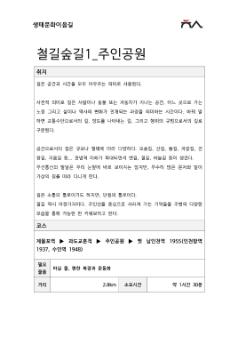 미추홀시민로드-생태문화이음길 4차시 문학산길2의 강의자료이다. 제작되어 참여자들에게 배포되었으며, 생태문화이음길에 대한 소개와 코스에 따른 사진들이 첨부되어있다. 생태문화이음길은 미추홀의 생태문화를 종합적으로 둘러볼 수 있는 탐방과정이다. 이 과정을 통해 미추홀의 산, 물, 길을 따라 걸으며 지역의 지형을 바라보는 시야를 넓혀가고자 한다. • 쪽수 : 8쪽 • 크기 : 1,070KB