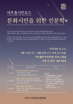 우리는 지역, 마을, 개인마다 저마다의 가치를 찾아가는 다양성의 시대를 맞이하고 있습니다. 기존에 당연하다고 해왔던 것들에 대해 다시 질문을 던지며, 우리들의 가치와 방향에 대해 고민할 필요성이 있습니다. 인문학은 지식을 익히는 데서 그치는 것이 아니라, 우리가 실생활에서 마주하는 문제들을 어떻게 인문학적으로 고민하고, 원만한 사회적 합의를 만들어 살기 좋은 방향으로 만들어 갈 수 있을지, 3주 간의 인문학 강좌를 통해 질문을 던지고자 합니다. - 대상 : 인천시민 누구나 - 일정 : 2022년 8월 17일(수) ~ 8월 31일(수) 매주 수요일 저녁6시30분 - 장소: 미추홀학산문화원 프로그램실