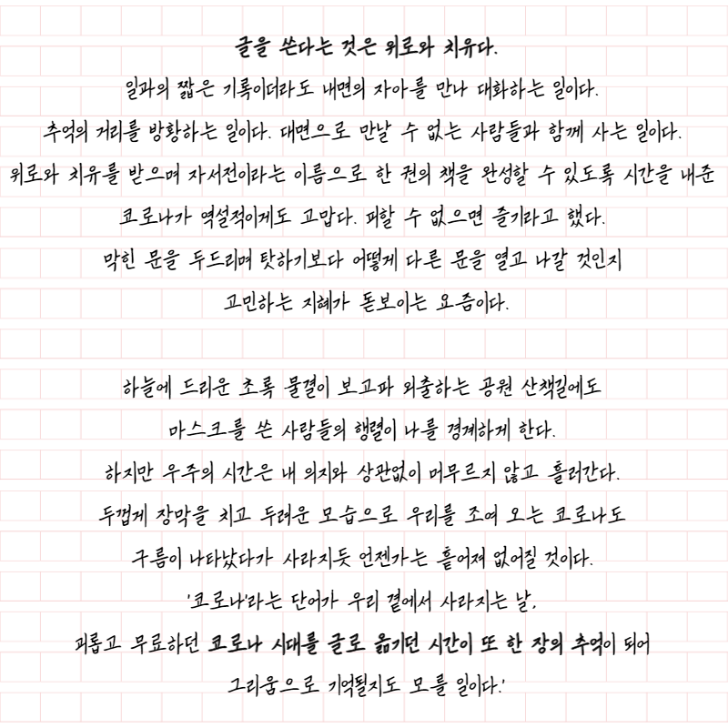어느덧 코로나가 삶 속에 한 부분으로 자리 잡아, 모두가 적응하며 살아가고 있습니다.