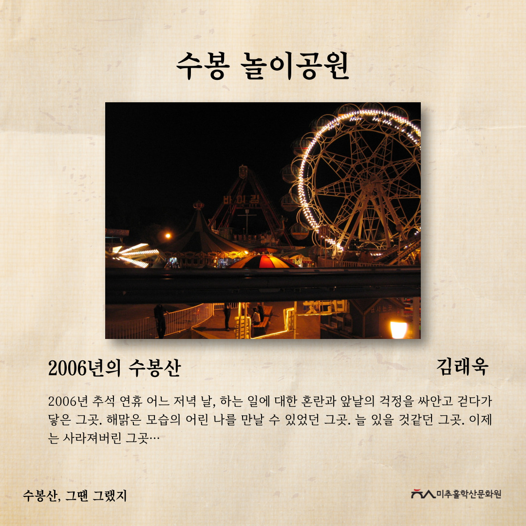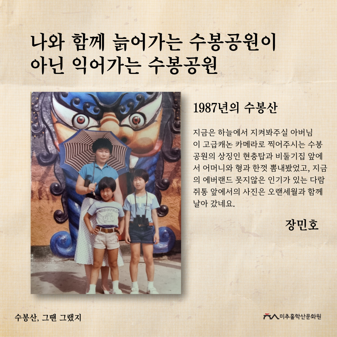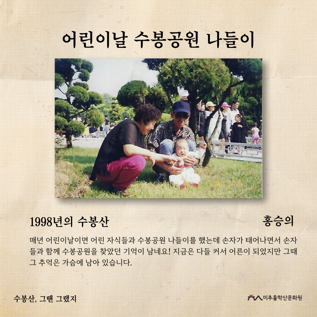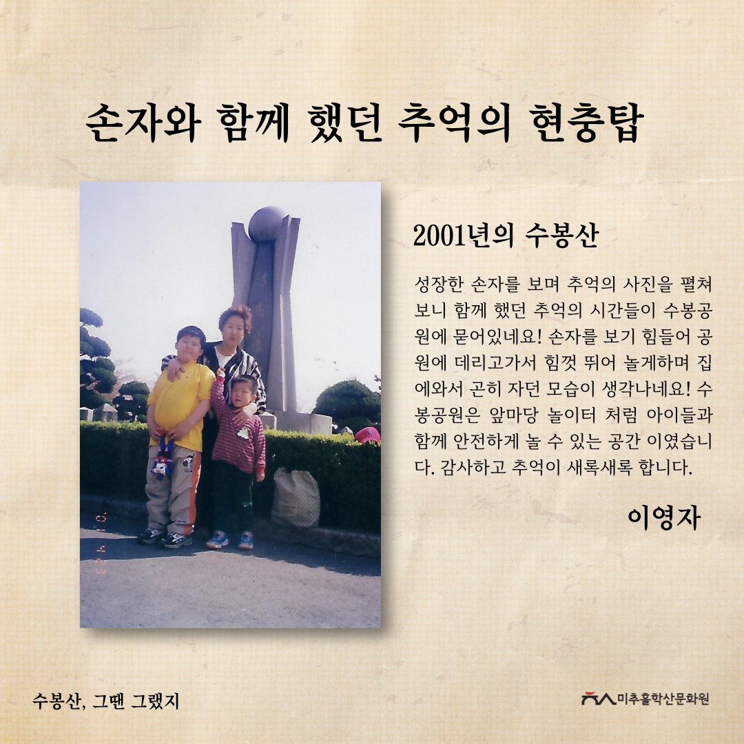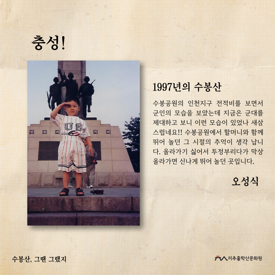 수봉산은 인천광역시 미추홀구 주안동, 숭의동, 용현동, 도화동 일대, 바로 미추홀구 중심에 위치한 산입니다. 현충탑, 망배단, 6.25참전기념비 등 여러 기념비와 탑이 존재하여 역사적으로나, 옛 아이들의 놀이터였던 수봉랜드가 있었던 자리로 문화적으로나 주민들에게 많은 의미가 있는 지역문화자원입니다.