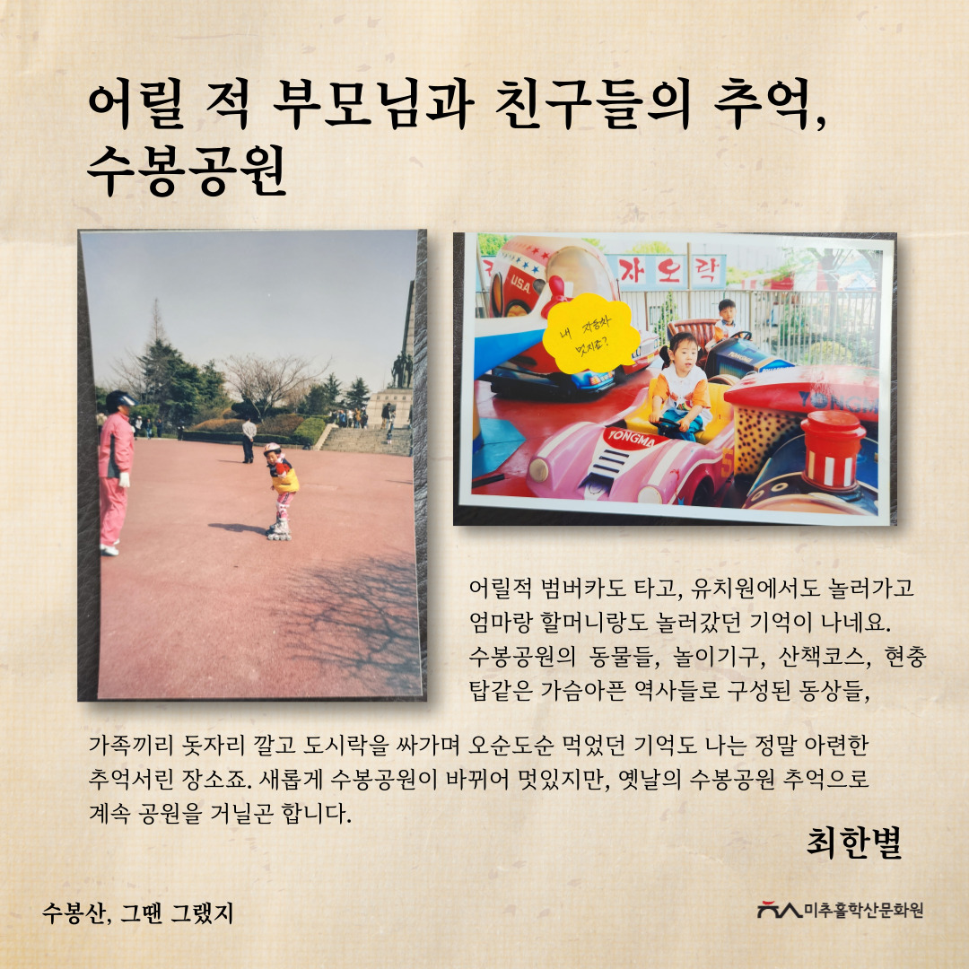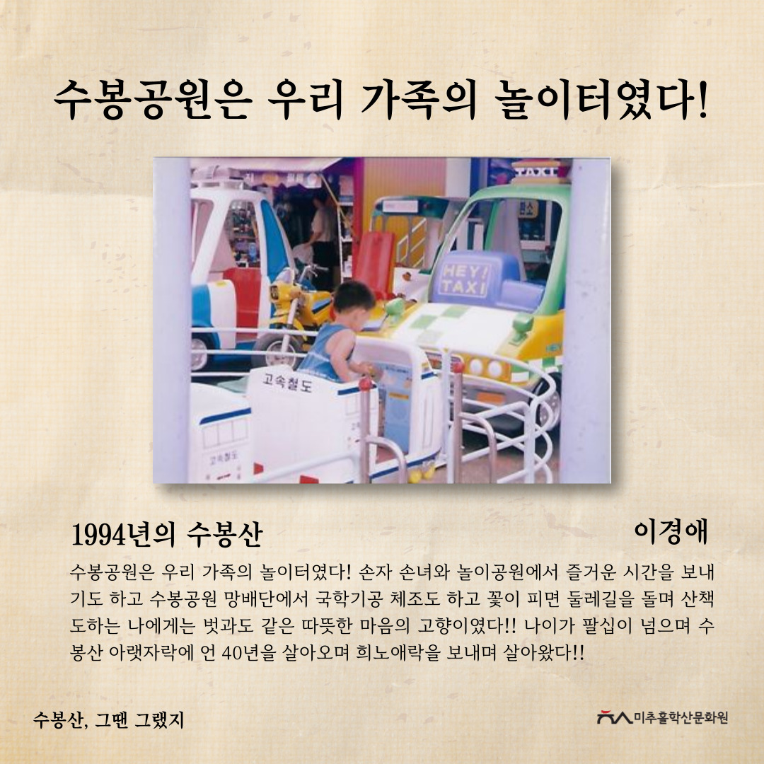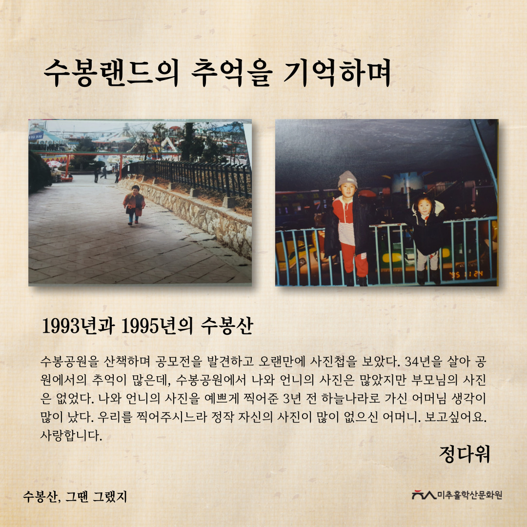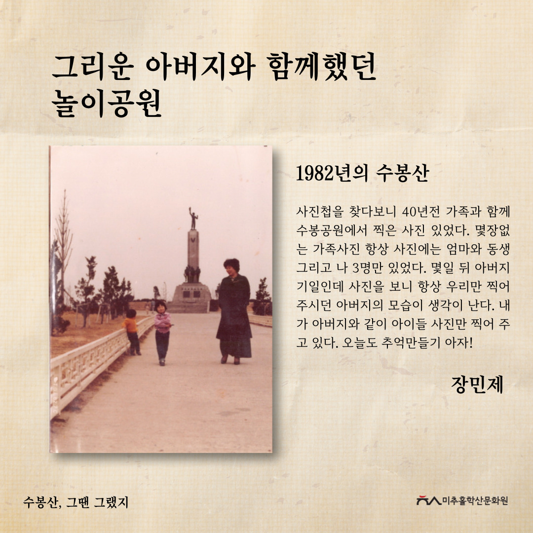 '수봉산, 그땐 그랬지' 공모전을 통해 주민들의 시선으로 기록된 사진과 이야기를 모아 과거의 생활사와 환경을 볼 수 있었고, 미래의 귀중한 기록으로 남게 되었다고 생각합니다. 또한, 수봉산이 가지고 있는 의미를 각자 새기고 돌아보며 내 옆에 항상 있었던 산이 새롭게 다가오는 시간이 되지 않았을까 합니다.