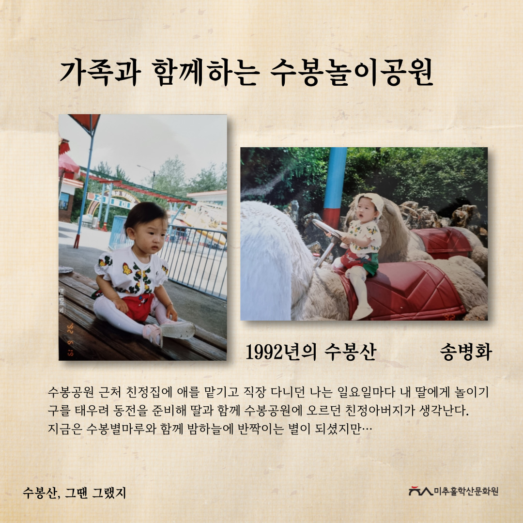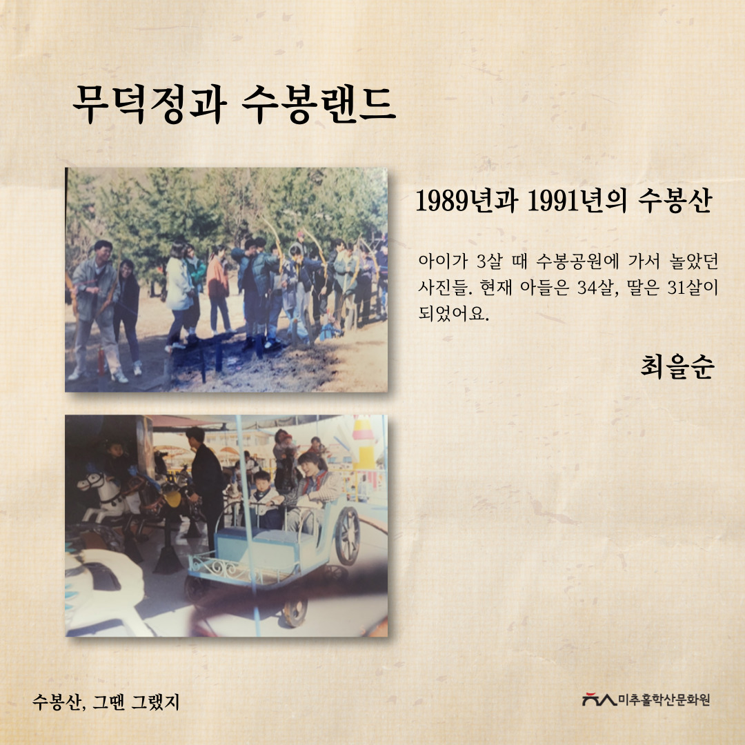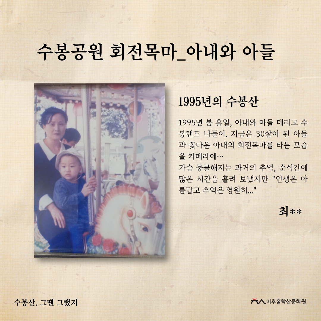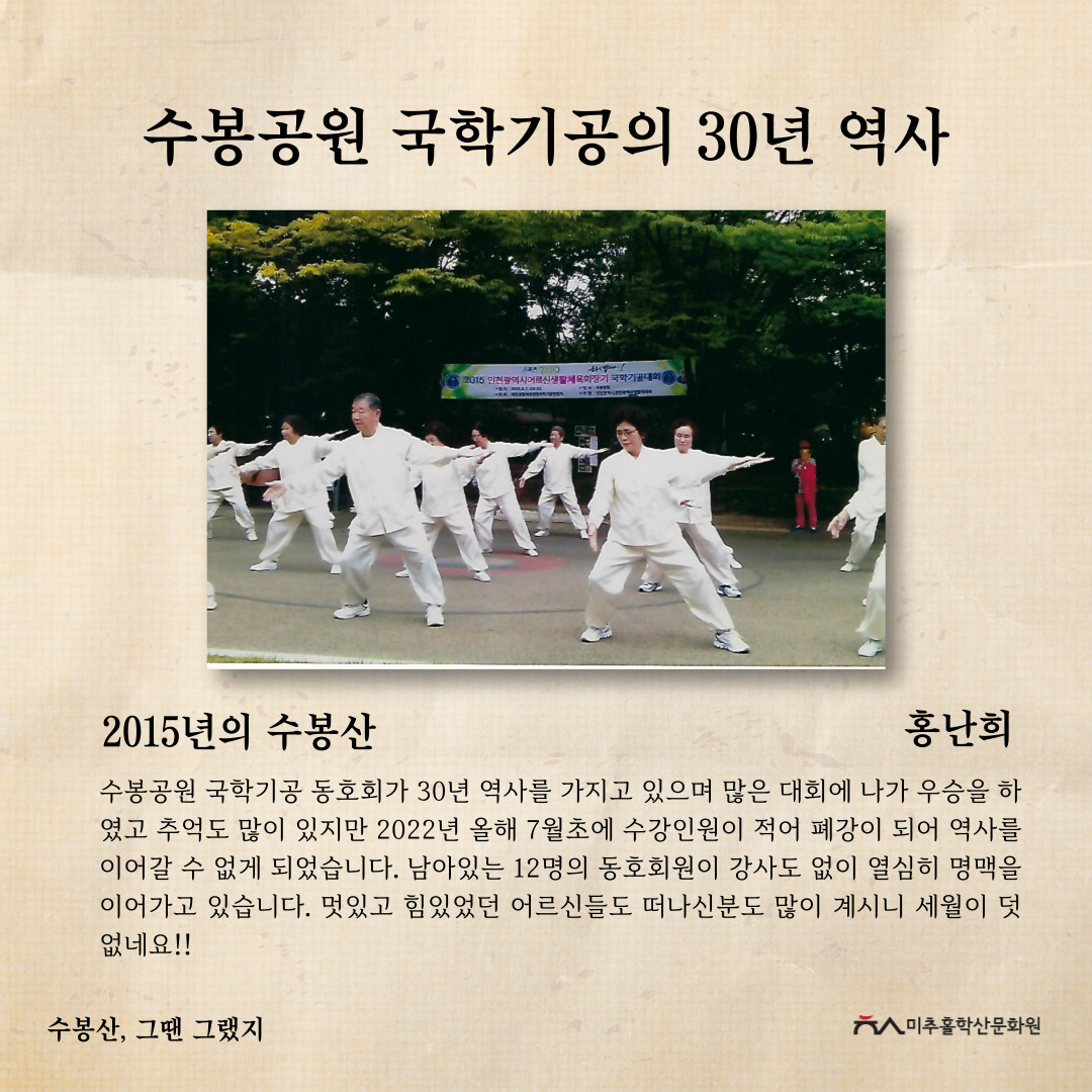 '수봉산, 그땐 그랬지' 공모전을 통해 주민들의 시선으로 기록된 사진과 이야기를 모아 과거의 생활사와 환경을 볼 수 있었고, 미래의 귀중한 기록으로 남게 되었다고 생각합니다. 또한, 수봉산이 가지고 있는 의미를 각자 새기고 돌아보며 내 옆에 항상 있었던 산이 새롭게 다가오는 시간이 되지 않았을까 합니다.