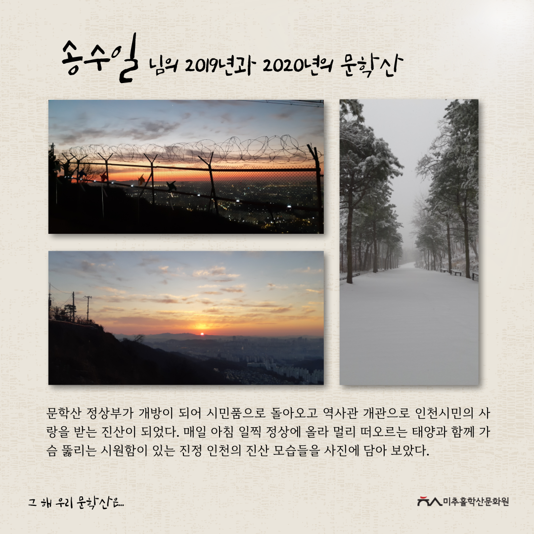 옛 문학산의 모습과 현재 모습을 비교한 사진, 겨울의 문학산, 설화가 담겨있는 배바위에서 찍은 사진, 오징어게임을 연상시키는 사진, 앞으로의 기록물로 가치가 있는 사진 등 주민들의 다양한 사진들이 모아져서 단순한 사진이 아닌 그 안에 담긴 각각의 메시지를 볼 수 있는 재미있는 공모전이 되었습니다.