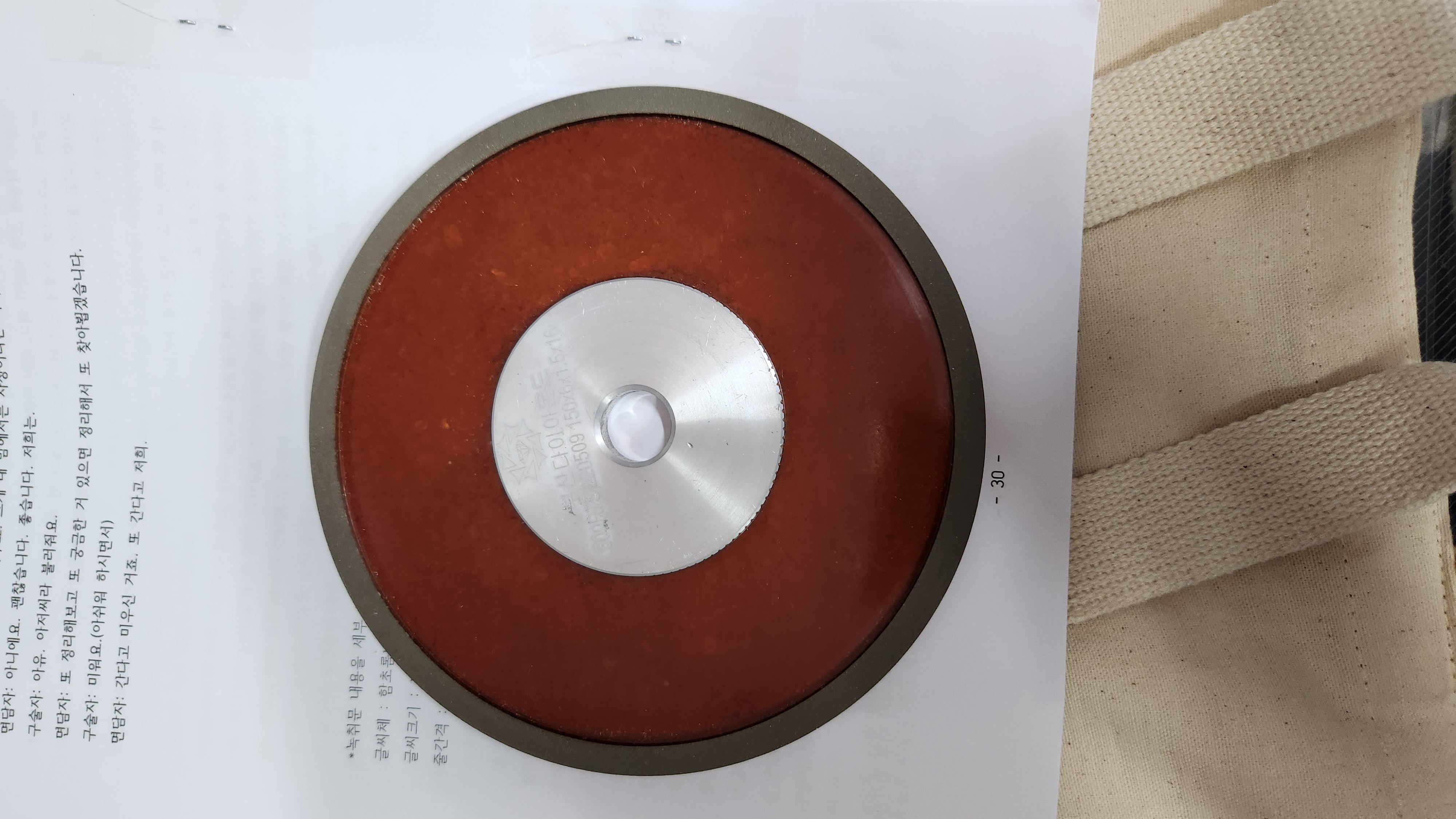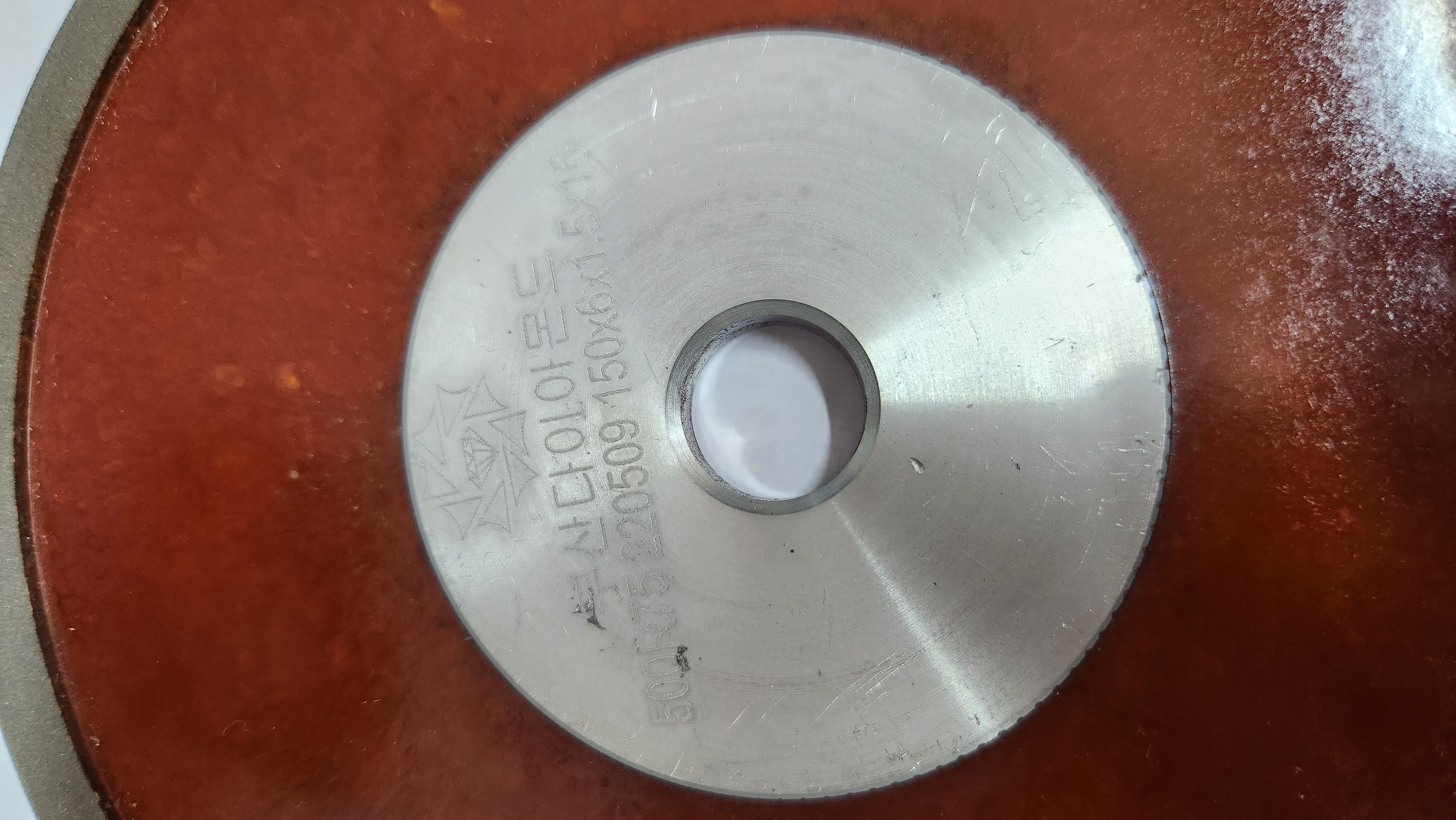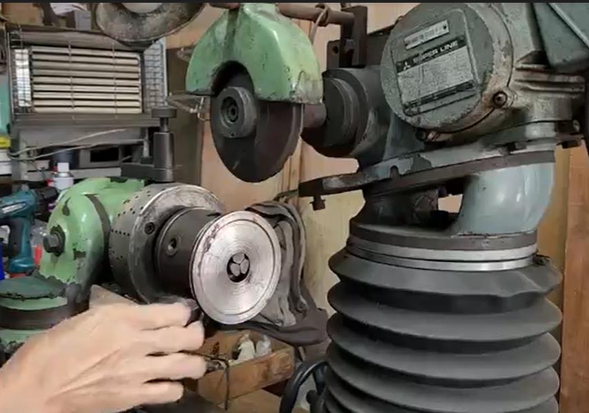 갈 때 사용하는 동그란 판을 다이아몬드 휠이라고 하는데 부산 다이아몬드 회사에서 제작되어 올라오는 거예요. 그게 빨갛게 달았다가 식으면은 그 강도가 그대로 있는 거예요. 강도가 참 세요. 저거 붙일 때도 전기 기계로다가 해가지고, 빨갛게 달아야지만 붙어요. 또 접착제를 약칠을 해 가지고 이걸 붙이지. 규모가 커지고 제작을 하는 집들도 기계 자동화가 되기 이전에는 전부 아주머니들이 만들었어요. 당시에 사람들이 앉아서 그거 붙였을 때 생산 수치는 지금으로 치면 얼마가 안 되지. 지금은 자동화가 돼서. 이거 한 달에 한 일곱 개씩은 써요. 기계 저거는 지금 새카맣게 돼서 그렇지 원래는 이런 건데 더 넓어. 이거는 6mm 지만은 그거는 한 9mm나 10mm가 이렇게 되고, 이 구멍도 저 기계가 커요. 24.5mm가 1인치인데 인치니부니까 한 삼십몇 mm 될 거에요. 요게 규격이 넓으면 넓을수록 거기 계산 공식에 준 해가지고 가기 때문에 가격이 다 달라요. 이거는 측면으로 쓰는 거지만 이건 스트레이트로 쓰는 거지.