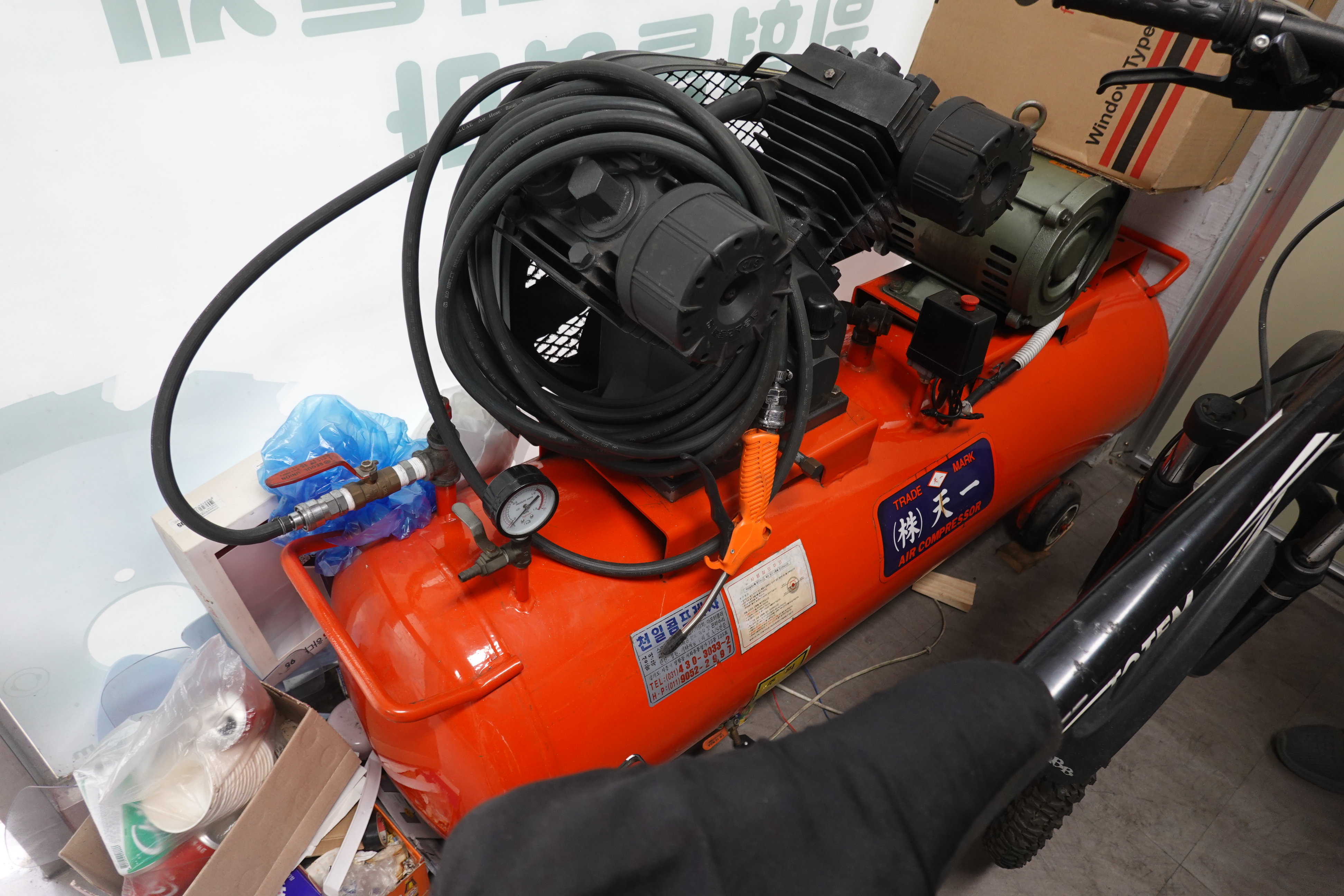 팁은 ‘긴노’라고 하는 명칭인 재료로 합금을 했는데, 은이 많이 들어가는 접착이에요. 이거 전부 산소 달고 불에다 달궈 가지고 하기 때문에 시커멓게 된다고. 그때 콤프레샤 돌려 가지고 강도가 아주 센 금강석으로 만든 금강사(모래 형태)로 때리면은 이 쇠가 약간 거칠었던 게 뽀얗고 깨끗하게 그렇게 돼요. 그게 샌딩작업이지. 이사 오기 전에 사용했었는데, 그것도 다 없애고 천일에서 나온 국산 콤프레샤만 남았어요. 샌딩이 잘 되려면 연속해서 금강사로 때려야 하니까 차징(charging) 양이 많이 필요해서 큰 거예요. 이사 오기 전 가게에서는 톱 제작의 시작부터 끝까지 다 했었지.