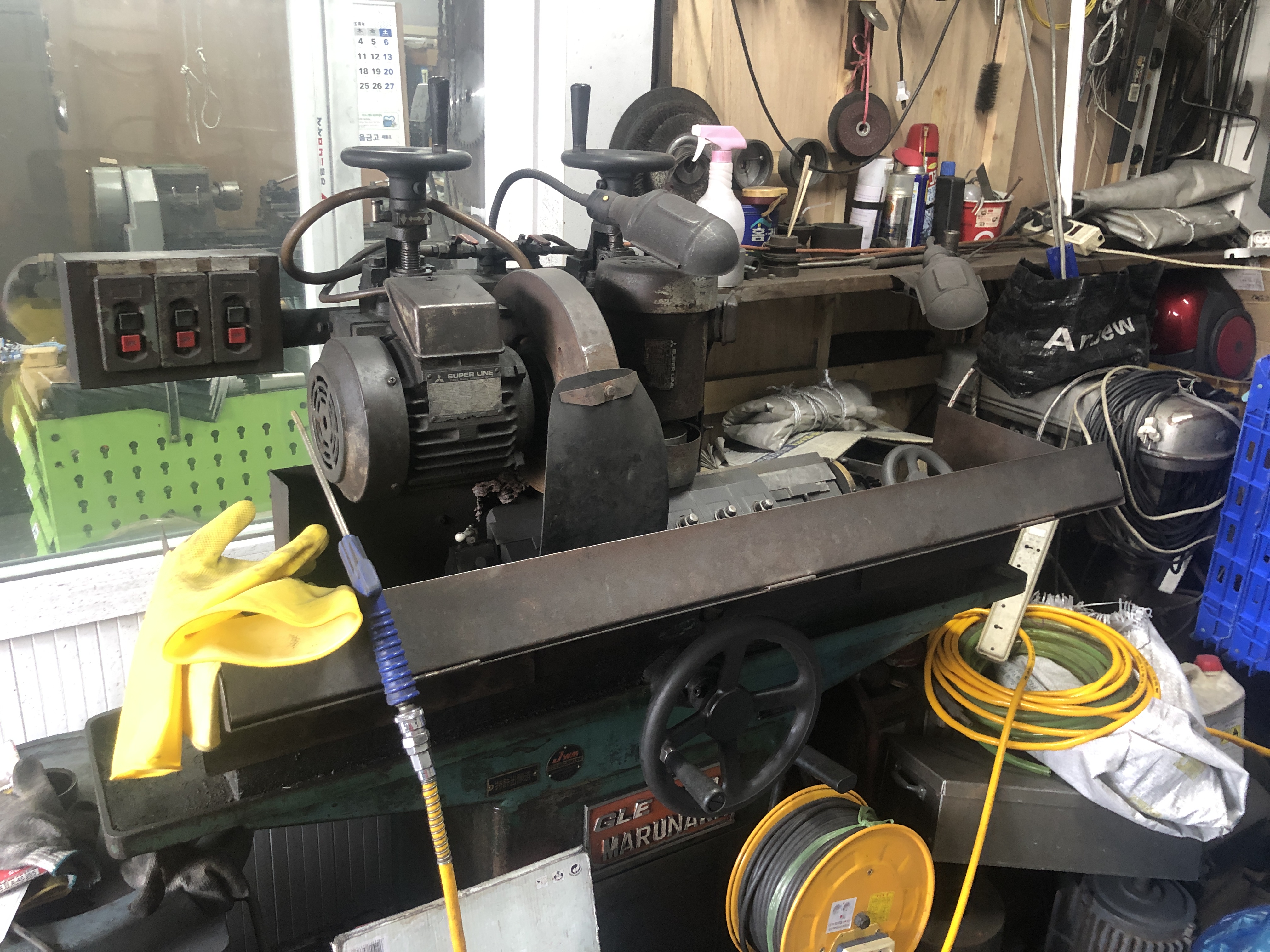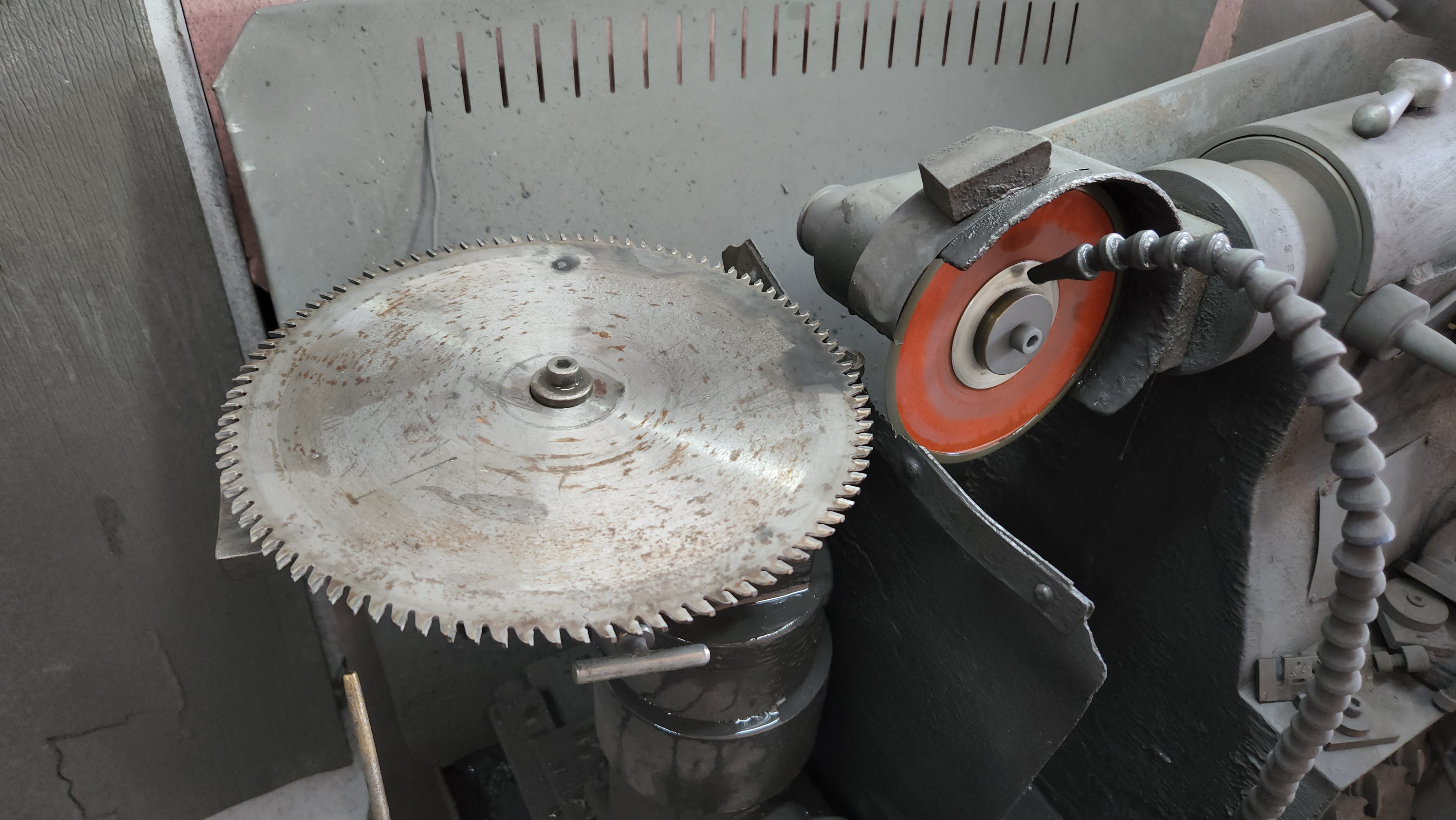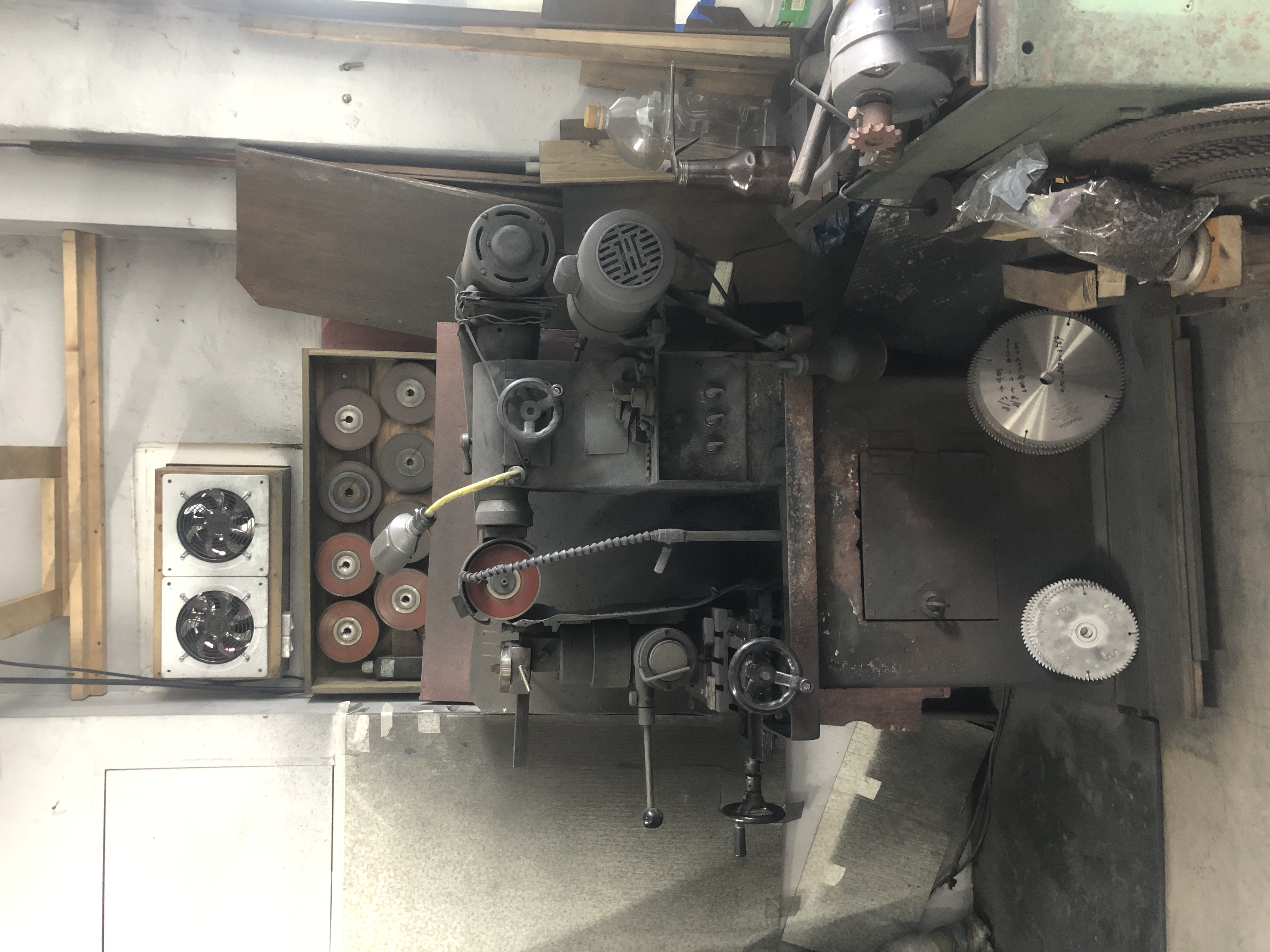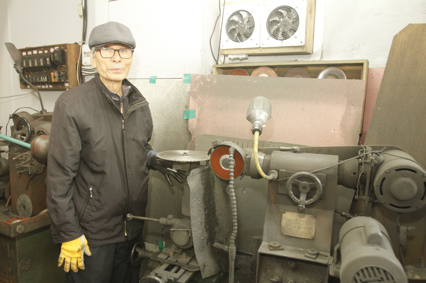 제가 사업장을 오픈하기 전에 큰 회사에서 공무부장을 했어요. 회사에 있으면서 일본에 출장 갔을 때 연마 기계 설계도랑 일부 부품(현재 사업장 캐비넷에 있는 부품) 같은 걸 줘서 그걸로 영등포에 있었던 대일 기계에서 지금 사용하는 톱 연마 기계를 제작해 온 거에요. 그래서 사용해 오던 게 오늘까지 참 잘 썼어요. 국산 기계 그렇게 오래 쓰는 사람은 없어요. 처음에 왔을 때는 저거 색깔이 아주 맑은 색이었었지. 한 해 가고 또 가다 보니까 저렇게 새까맣게 된 거예요. 일을 적게 하면 기계도 색깔이 크게 변하질 않아요. 기계 돌리면 생기는 먼지가 많이 앉는데 이게 지워지지를 않아요. 쇳가루가 붙으면 철 수세미가 가지고 문질러도 잘 안되고. 기계 돌릴 때 분진이 덜 나고 열처리되라고 물을 뿌려요. 처음에는 맹물이 들어가고 그다음에는 연삭액이라는 약물이 들어가서 희석이 돼 가지고 나오는 거예요. 그리고 여기 붙어 있는 부분은 초경 팁이라고도 해. 이걸 가는 거지.