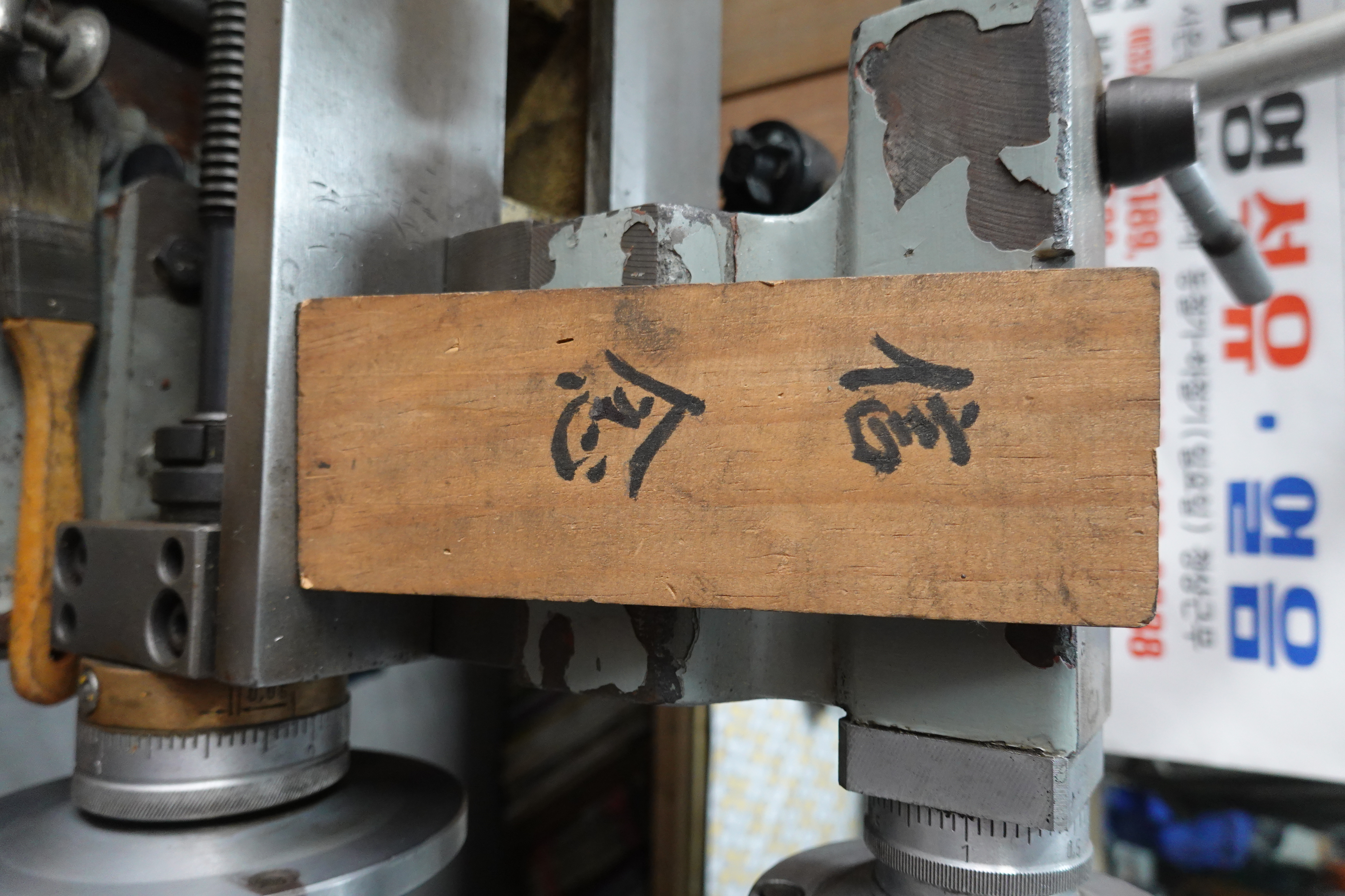 이 기계는 팁이 넓은 갓타날을 가는 기계는 이건데, 말하자면은 여기 문 같은 거 있잖아요? 문틀 형태가 다양하고 또 골이 있고 막 그렇잖아요. 그 홈을 파는 공구를 갓타날이라고 하는데, 그 공구가 저만큼 넓은 거지. 지금은 이런 게 PVC로 이렇게 나오지마는 그전에는 나무로 해야 하니까.