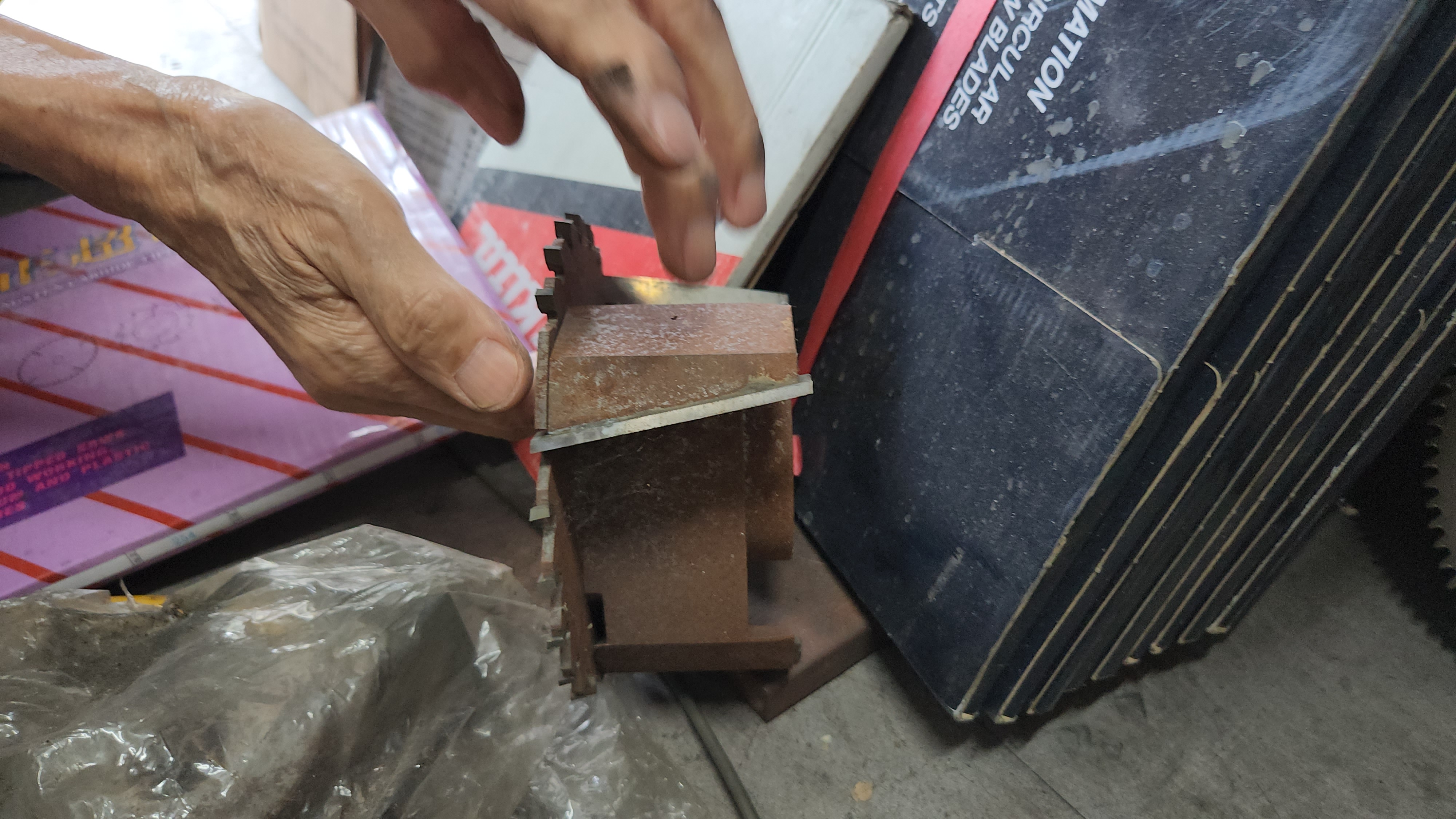 갓타날 같이 넓은 문틀을 짤 때 쓰는 톱은 성형할 때 환봉을 사다가 만들어요. 지금은 기계가 없어서 못 만들지만, 예전엔 톱 제작도 직접 했어요. 환봉은 숭의공구상가에 있는 조일기계랑 거래해서 받았는데, 쇠 종류랑 규격만 알려주면 딱딱 해놓고 둥그런 원판만 가져오는 거죠. 절단된 환봉을 기계에 물려가지고 원판을 깎은 후 2차로 밀링 작업을 해서 팁을 붙이는 거죠.