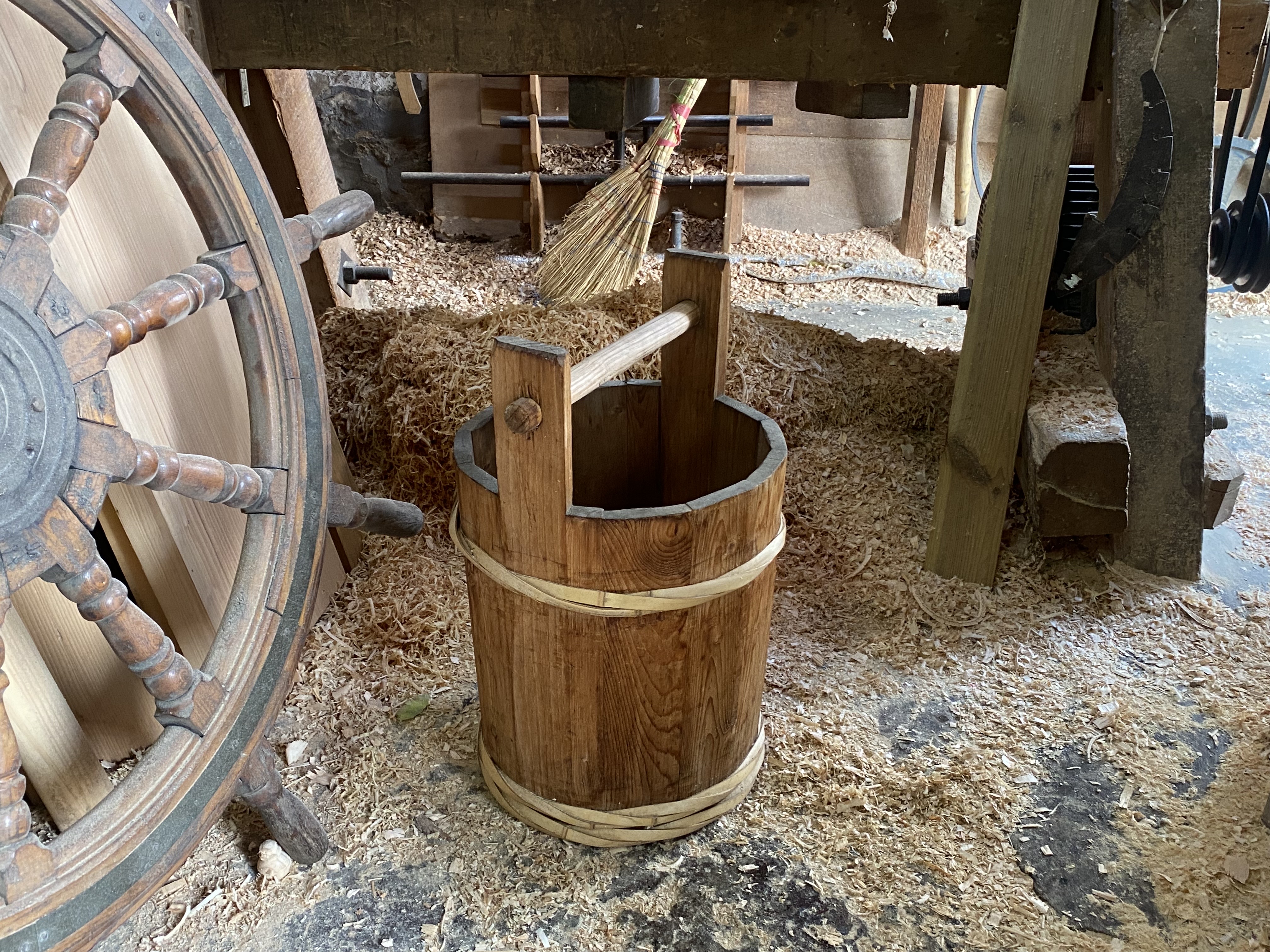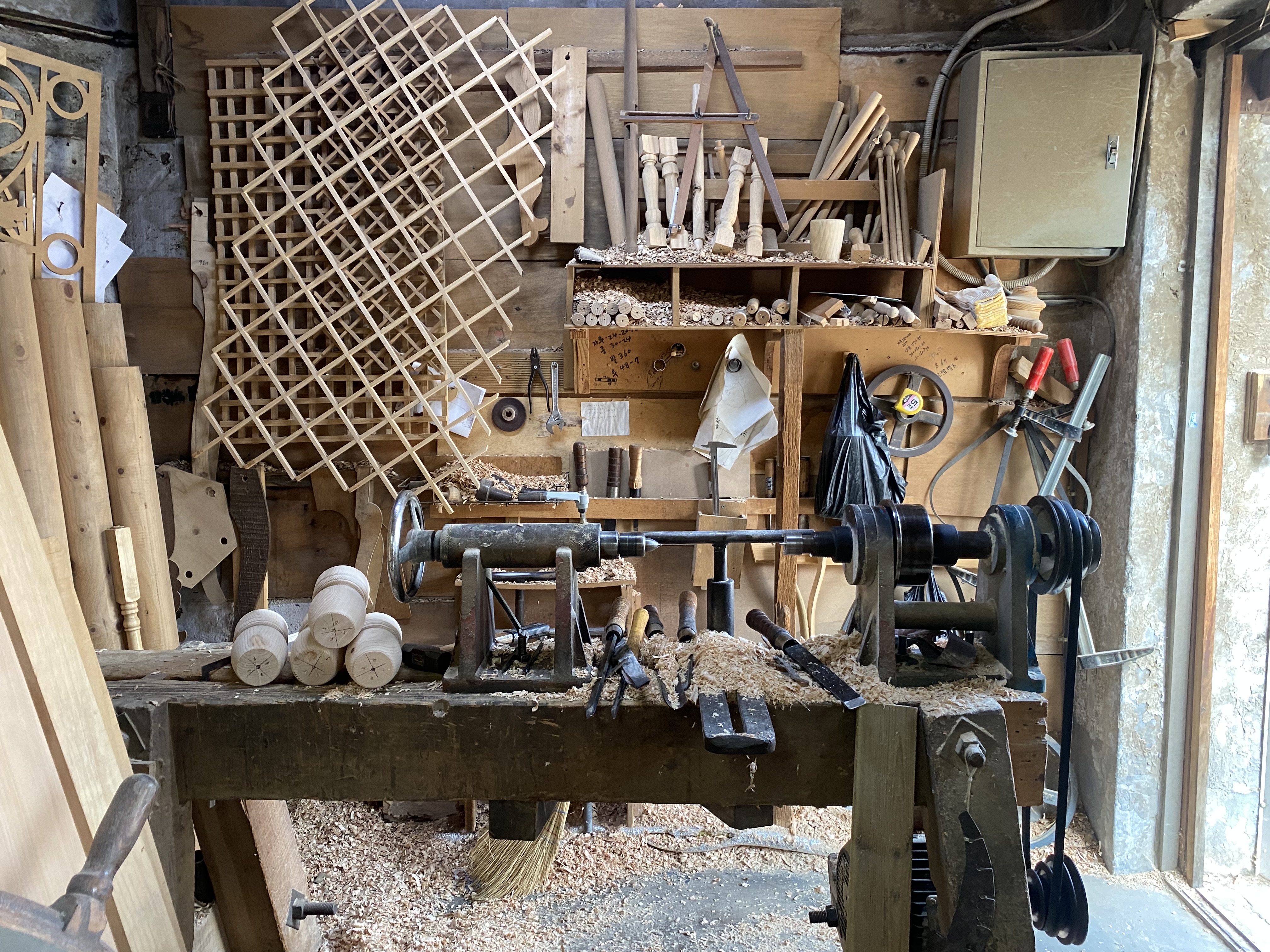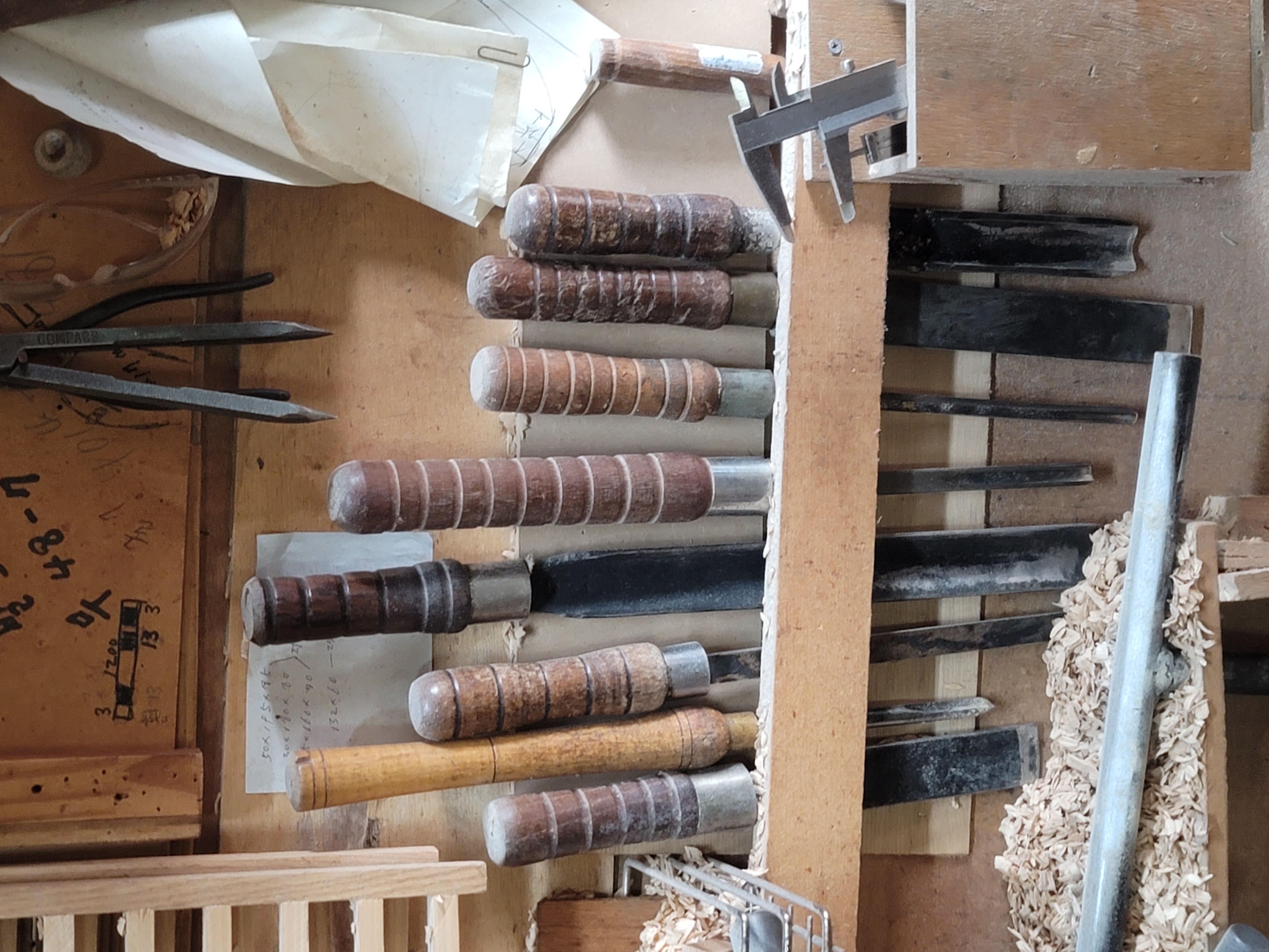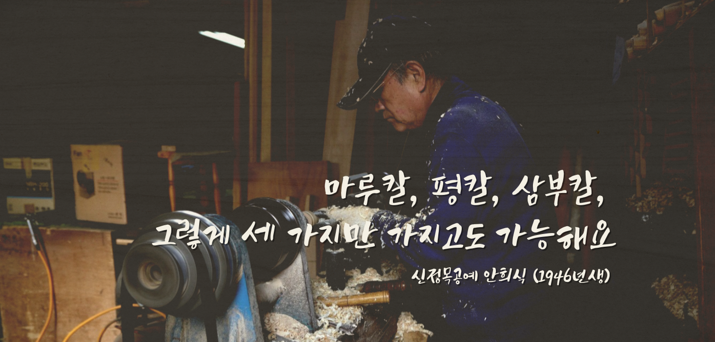 이건 허리 운동하는 거예요. 이 도구는 홈 팔 때 써요. 몇십 년 된 건데 철공소에서 주문 제작해서 맞춘 거예요. 이런 칼도 맞춰오고 그래요. 연장은 주로 세 가지면 돼. 세 가지가 거의 다 똑같은 거예요. 마루칼, 평칼, 삼부칼이라고 부르지. 우리한테 이게 자나 다름없어. 세 가지 주로 많이 써요. 그렇게 세 가지만 가지고도 다 가능해요. 이거는 겉목 칠 때 하는 거고 이거는 홈파는 거예요.