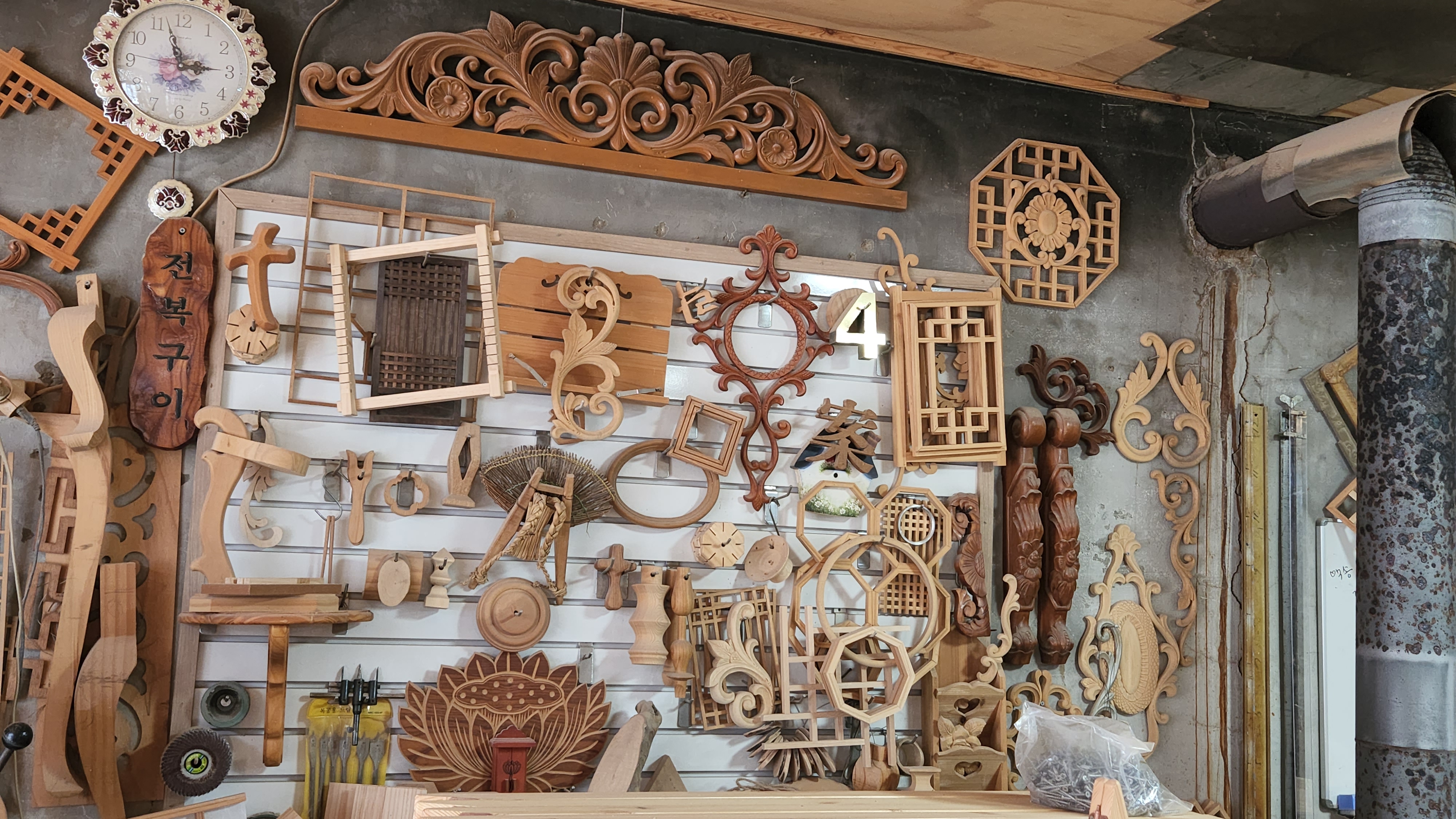 가구에 들어가는 거예요. 나는 공예를 해도 가구 조각만 많이 했어요. 저기 벽에 있잖아요. 저런 조각들은 그때 다 배운 거예요.