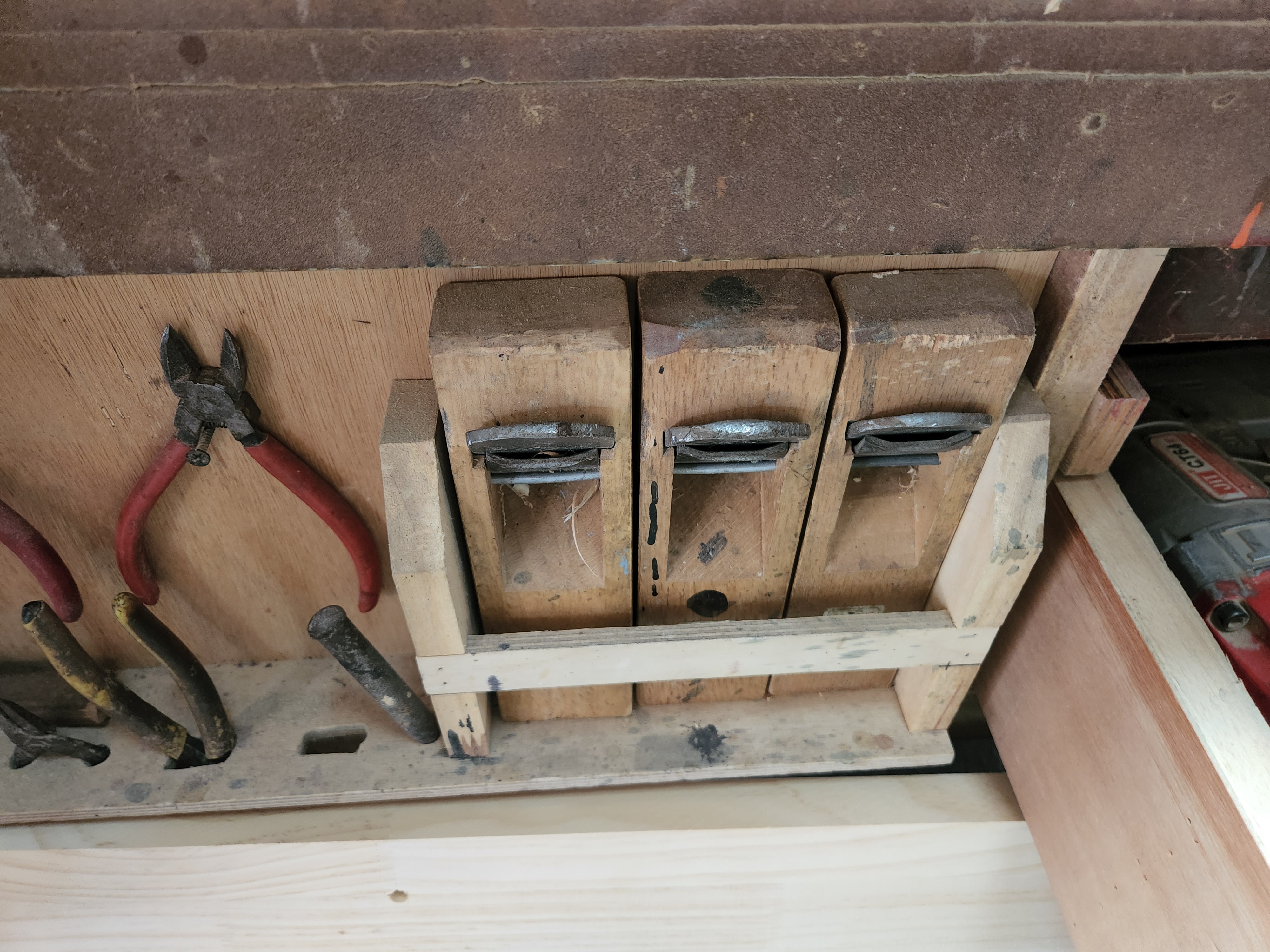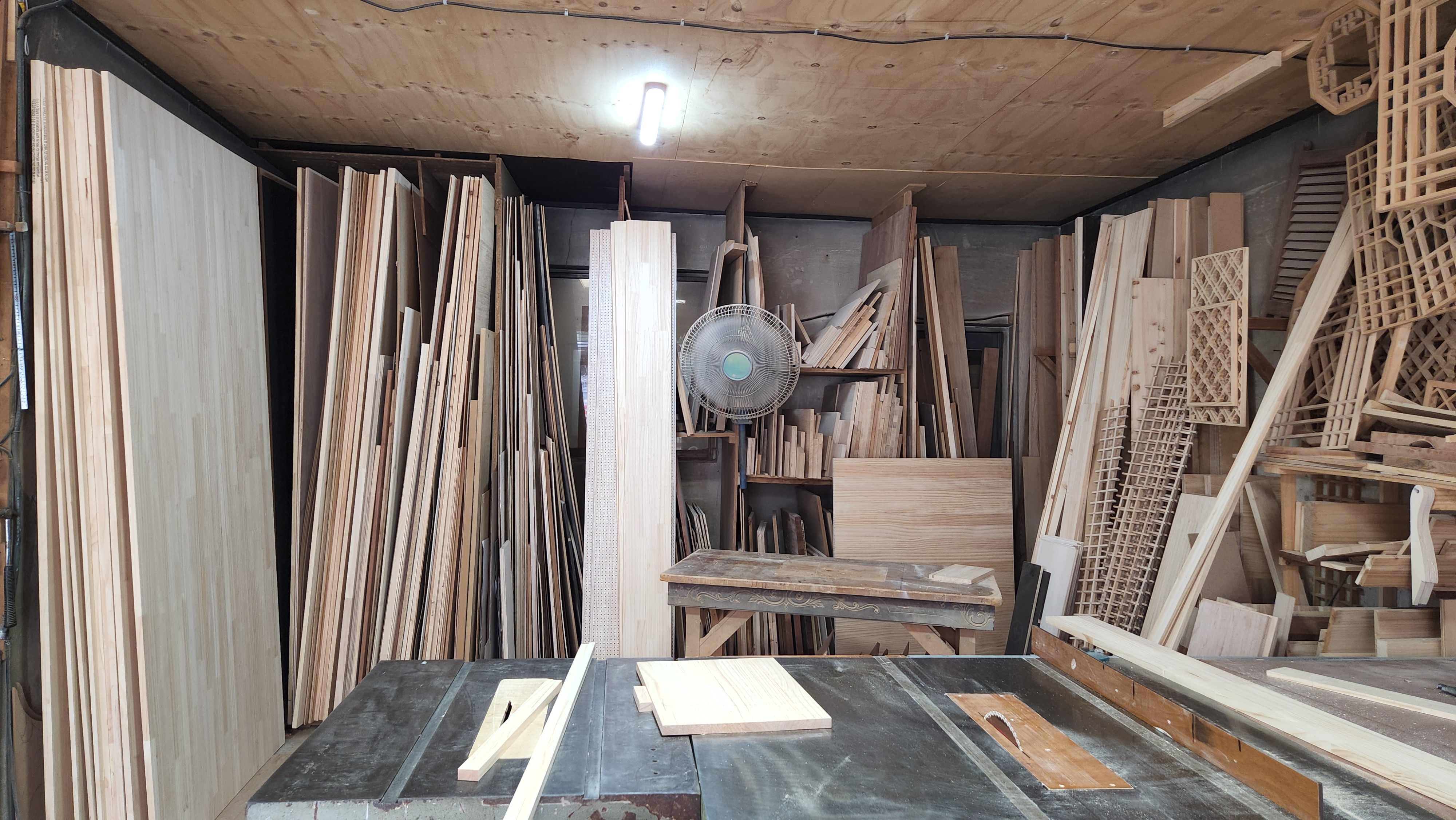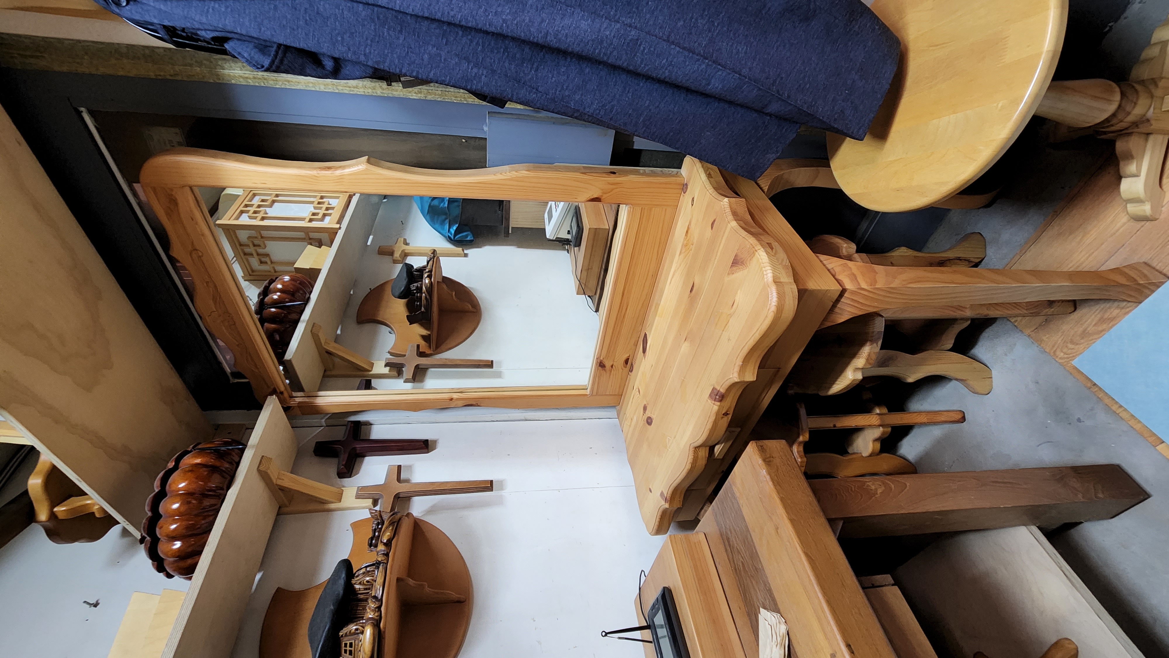 많이 만들어 갖다줬는데 애들이 새로 아파트 사서 이사 가면서 싹 다 없애버리더라고요. 별거 다 만들어줬었어요. 지금 새로 만들어달라는 것도 없어요.우리 집에도 가보면 옛날에는 내가 만드는 작품들이 좀 있었는데 우리 집사람이 가져오는 거 싫어해 이제는. 이 안에 들어가면 교육하면서 만든 미니 화장대들도 있고 별거 다 있어요. 이 동네 다른 사람들 보면 이렇게 나같이 이렇게 여러 가지 하는 사람 많지 않아요. 조각일 겸해가면서 가구를 짜는 사람은 거의 없어요. 지금 저기 물건들을 보면 별 용도가 다 있어.