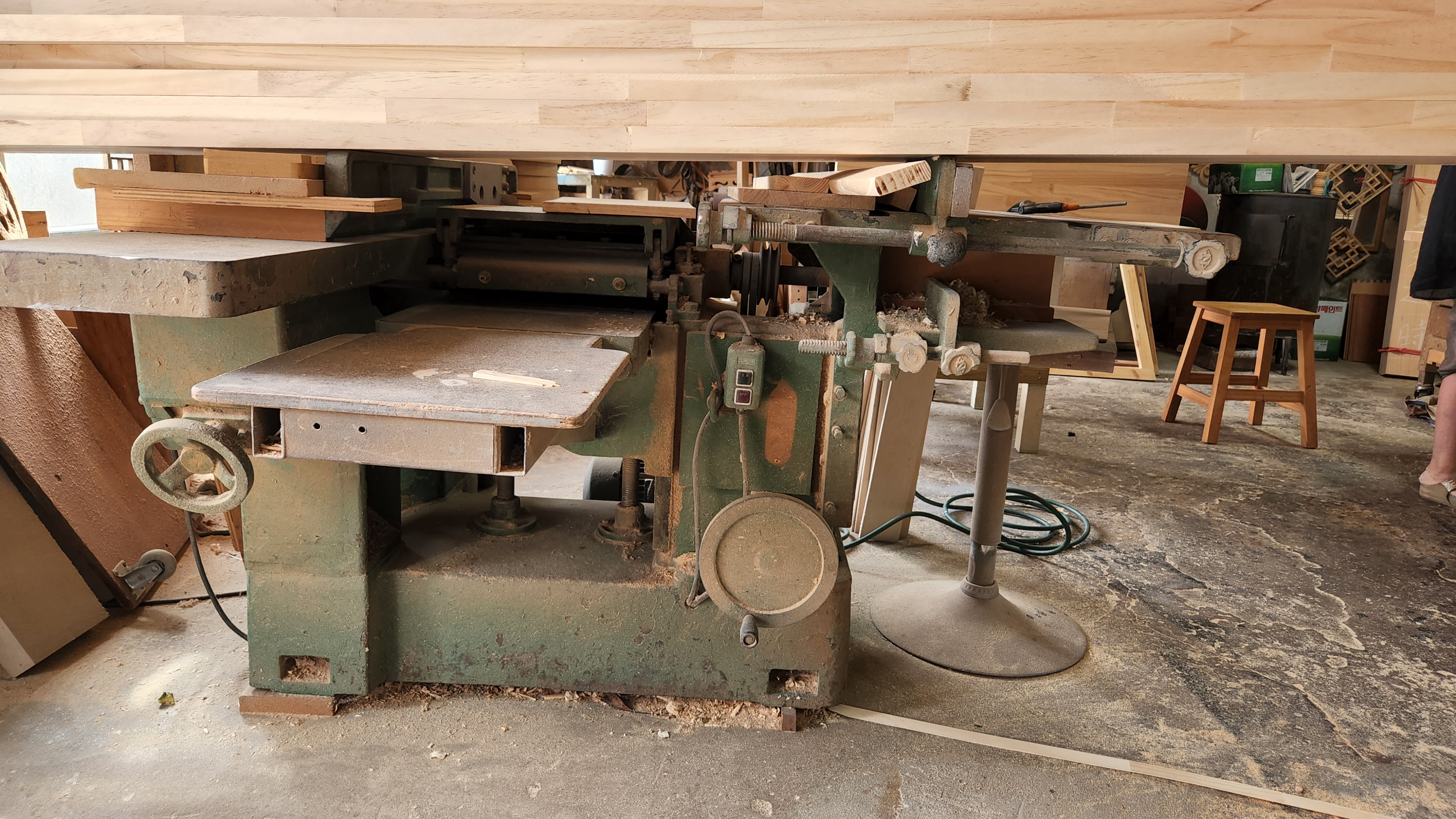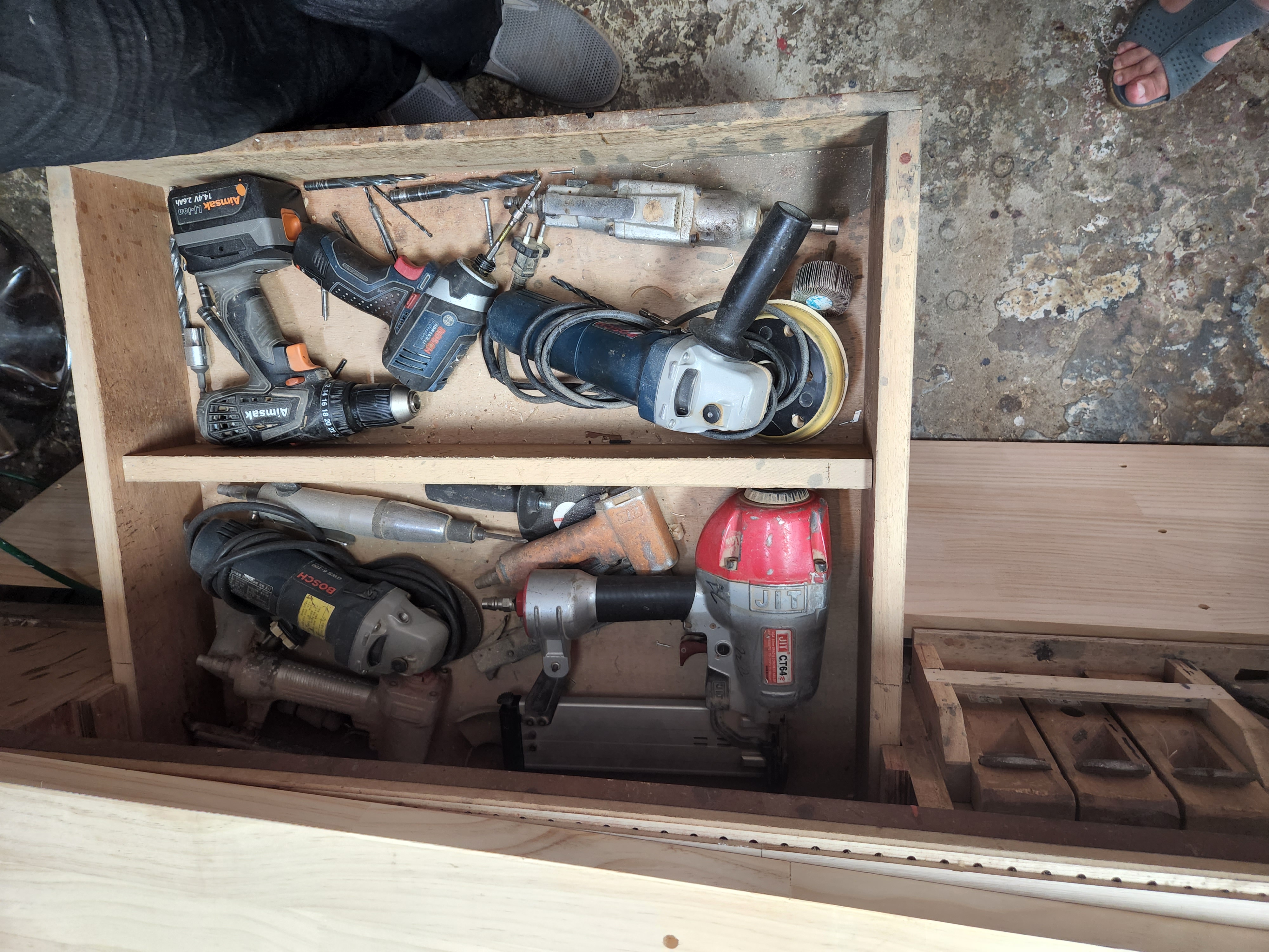 내가 주로 쓰는 건 일본 거. 이거 내가 한 이십몇 년 썼는데도 아직 고장 하나도 안 나. 서비스받을 일이 없어요. 다른 건 고쳤을 수도 있겠지만요. 이거 같은 경우에는 이게 각도기인데 내가 쓴 지가 20 몇 년 됐는데도 고장이 안 나요. 옆에 사람들 각도기라고 중국, 대만 거 몇 년 못 쓰고 망가져서 버리잖아. 이게 마끼다 건데. 미국 거는 기계 덩치가 크고 일본 거는 얍삽하고 유연하고 잘 만들어져있고, 독일 거 좋은데 내가 지금 독일 거는 많이 사서 쓰는 게 없어요. 이런 드릴 같은 거 구멍 뚫는 드릴 같은 거 있잖아요. 보쉬 거, 이거는 독일 건가?그런데 이런 기계들이 국산은 금방 못 써요. 아직도 못 따라와요.처음에는 좀 싼 거 그냥 사 쓰다가 지금 이런 거 같은 경우는 내가 한 이십 년 썼어요. 여기 마끼다 일본 거. 한 20년 써도 아직도 견고해요. 근데 저 뭐야 마끼다라고 똑같은 게 아니고 오리지날 일본에서 만드는 마끼다가 아니고 대만이나 이런 데서 만들어온 거는 한 몇 년 쓰면 각도 안 맞고 기계가 막 틀려요. 그런 점이 있어요. 또 요즘 일본 못지않게 독일 게 좋아요. 그런데 가격이 비싸니까. 실제로 저는 일본 거 많이 써요. 저기 저 나무 깎는 기계도 일제고 일본 제가 많아요. 수십 년 일하면서 선택을 해서 쓰는 것들이죠.