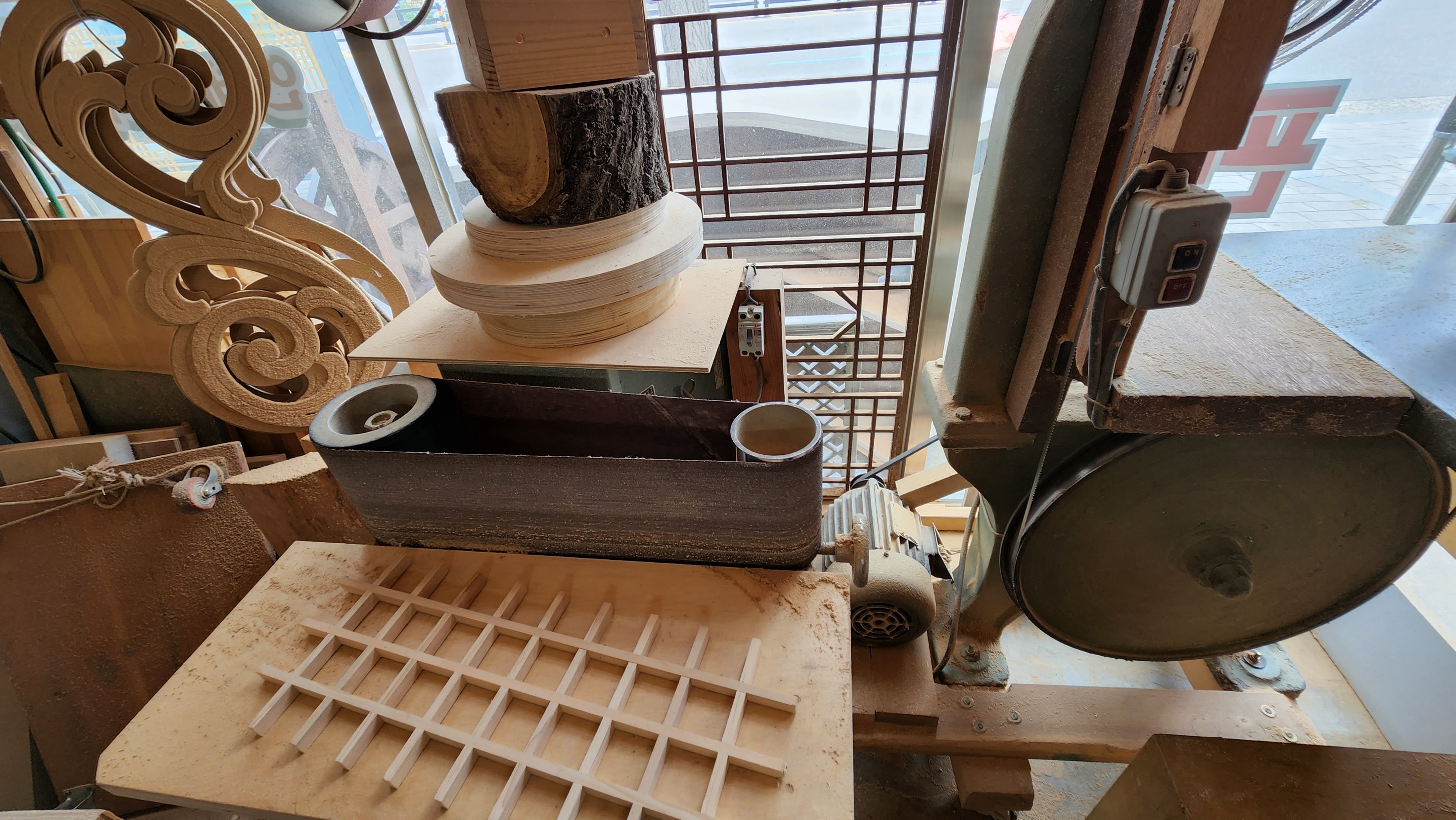옛날에는 손으로 대패질했죠. 지금은 기계로 거의 다 하잖아요. 옛날에 기술자들은 손으로 대패질 망치질, 톱으로 자르고 그걸 잘하는 사람이 목수지만 지금은 실제로 그것보다는 기계 잘 쓰는 목수라고 보면 돼요. 그럴 정도로 기계화가 됐다고. 저는 목공 목수를 먼저 한 게 아니고 저기 보면 조각 있잖아요. 저게 필요할 때 만들어 썼던 거예요. 전부요. 주문하면서 한두 개 나무 걸어놓고 때로는 일부러 모양을 한두 개 깎아놓은 것도 있고 그런 물건이에요. 원래가 조각했던 사람이라 내가 조각하다가 목수 일을 늦게 배워서 목수를 하다 보니까 여러 가지를 다 하죠. 저는 전천후로 다 해요. 지금도 조각 들어오면 조각도 해요. 지금 간판 들어오면 간판 파잖아요. 로구로도 조금씩은 깎는데 복잡하고 일부러 기계 놓고 쓰기 싫어서 거의 안 하는 거예요.