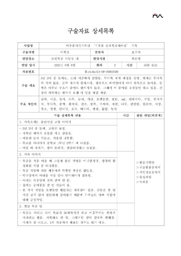 ※ 관련 구술 자료는 아래 관련 기록물 클릭을 통해 확인하실 수 있습니다.