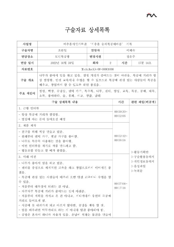 지역의 특색이 살아있는 숭의목공예마을에서 목공예의 일을 오랫동안 해 온 장인들의 구술로, 목공예의 변화상과 지역의 다양한 이야기들을 기록하고자 함.