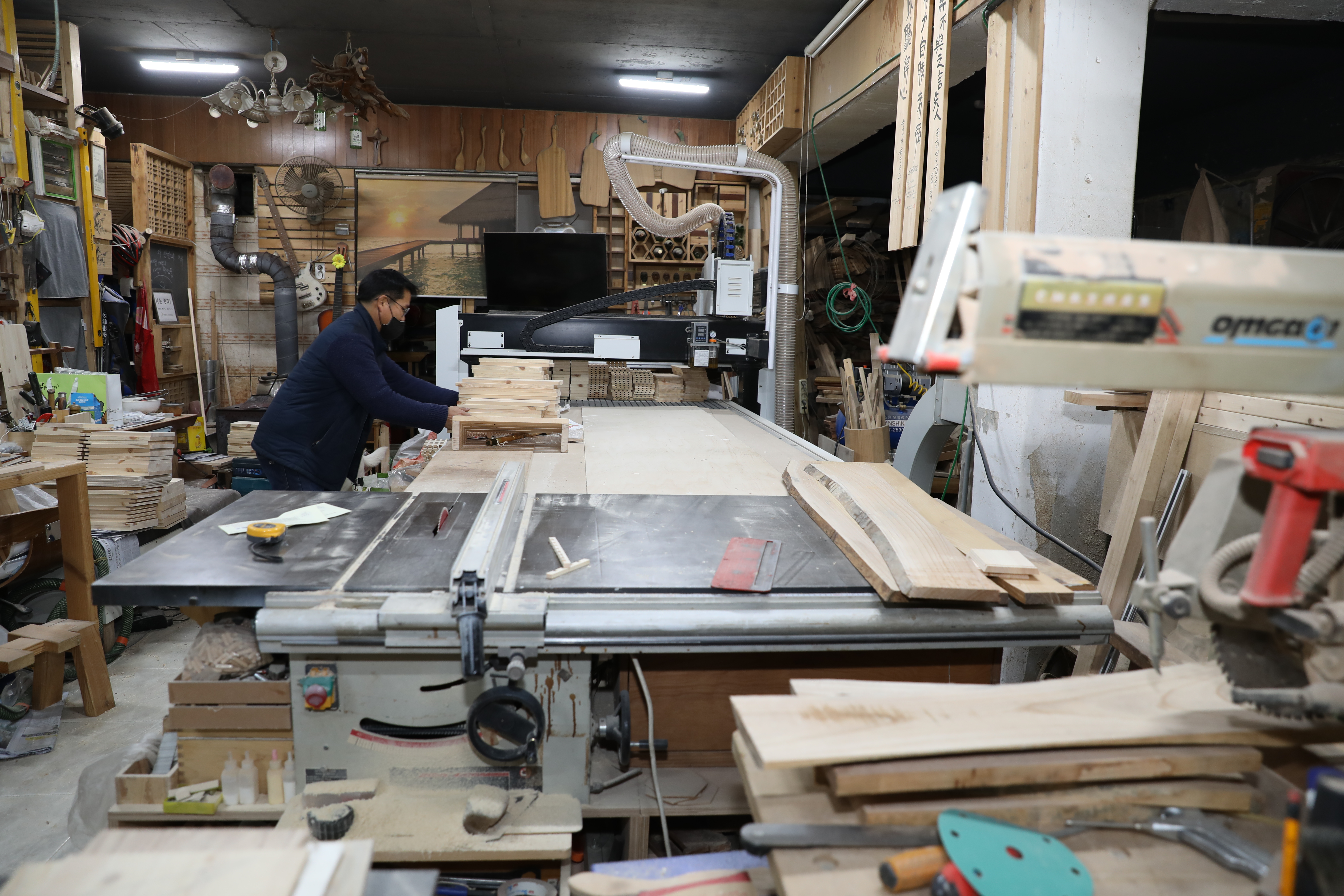 여기 목공예 거리에 있는 분들하고 비슷해요. 가구 주문받으면 제작하고 또 소품 같은 거. 저 같은 경우 인테리어 쪽도 좀 배워서 그쪽 일도 좀 하기도 하고. 그런데 이제 차후에는 지금 CNC라든가 그런 기계들이 있기 때문에 그런 거를 활용한 약간 전문적인 영역으로 만들어가려고요. 그러니까 이것저것 주문으로다가 만드는 방식이 아닌 제가 상품화를 해서 온라인이라든가 이런 쪽으로 하기 위한 발판을 삼으려고 하죠. 요즘 젊은 친구들이 이런 목공예거리 말고 개별적으로 일하면서 지금은 CNC 기계를 도입해서 사용해요.