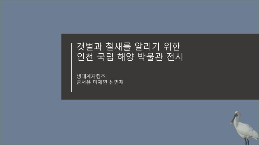 - 주요내용 : 갯벌의 중요성과 철새에게 갯벌이 필요한 이유를 인식하고, 이를 인천시민들에게 알리기 위해 2024년 완공예정인 국립인천해양박물관에 인천 갯벌과 철새에 대한 전시공간을 확보하여 인천의 철새지도, 철새 캐릭터화 등을 통해 관련 인지도를 확장하도록 제안