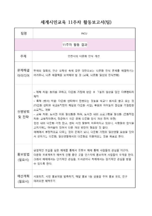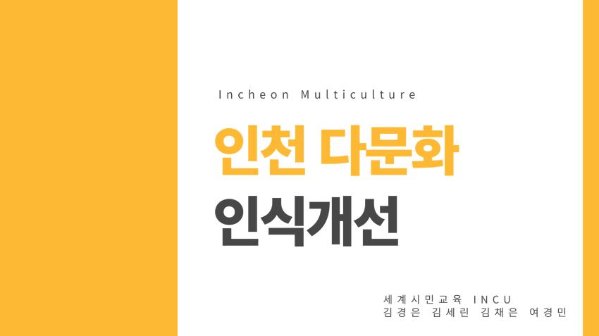 - 주요내용 : 인천의 이주민 차별문제를 주제로 하여, 인천의 이주 실태과 차별, 저항에 대한 정보를 수집함으로서 외국 이주민에 대한 부정적 인식을 개선할 방법의 일환으로 다양성을 주제로 한 축제 개최로 방향을 잡고 그 기획서를 제작