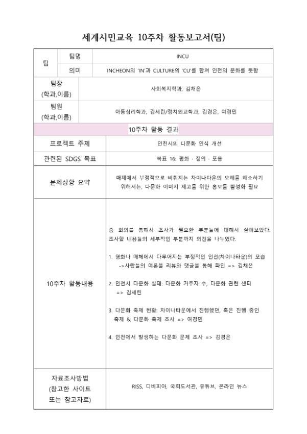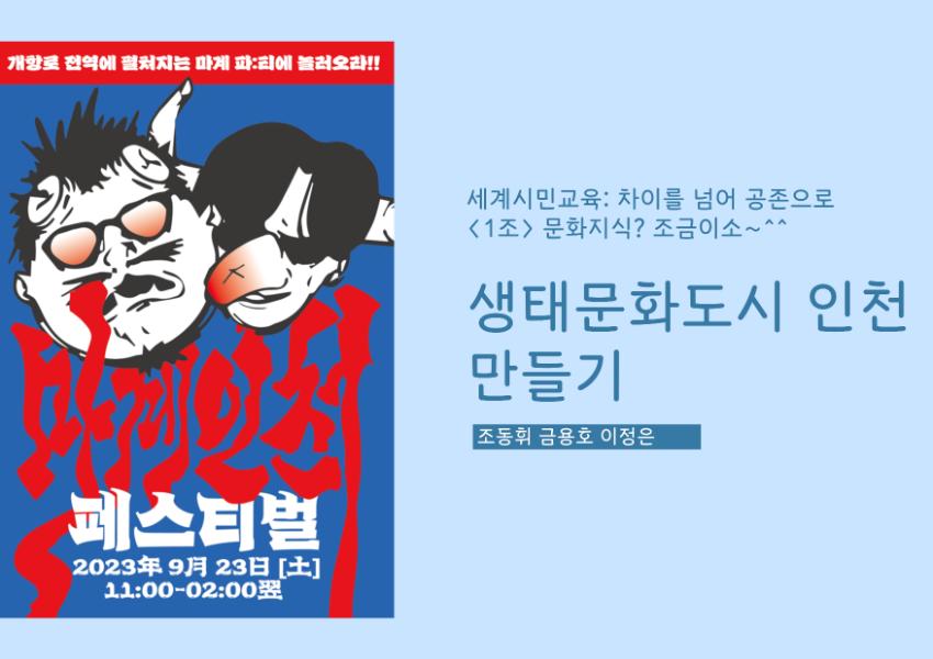 인하대학교 2023년 2학기 세계시민성교육 강좌와 함께한 20여명의 학생들이 과제의 일환으로 인천 및 미추홀의 지역문제를 고찰하고 그 문제를 해결하기 위한 실천방향을 조별로 기획하고 제안합니다. 학생들이 지역을 바라보는 시선과 다양한 아이디어를 들여다보면 좋겠습니다.