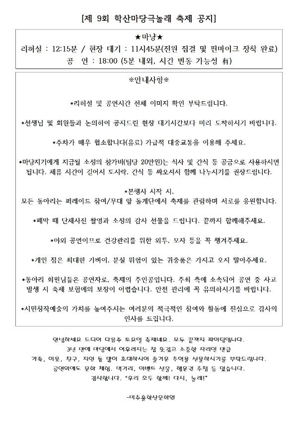 그동안 꾸준하게 학산마당극놀래를 지원해 주신 미추홀 구청과 연대와 협력의 가치로 함께해 주신 학익1동 행정복지센터와 주민자치회, 인천시각장애인복지관, 미추홀구 가족지원센터, 숭의목공예센터, 용일초등학교 등 지역의 많은 관계 기관과 단체들에 진심으로 감사드립니다.