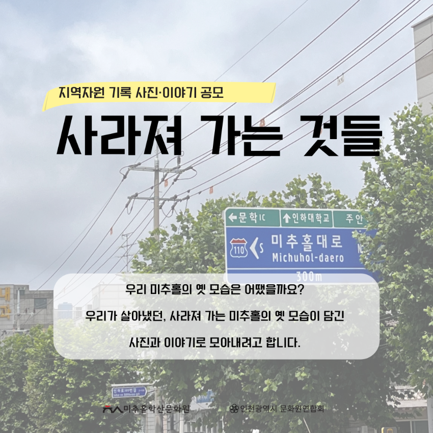 이에 미추홀학산문화원은 미추홀구의 사라져 가는 풍경을 담기 위하여 사진 이야기 공모 '사라져 가는 것들'을 운영했습니다.