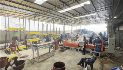 계기는 아버지가 아시겠죠. 아버지가 처음에 하셨으니까. 근데 고무대야는 예전에 우리가 재활용을 많이 안 했잖아요. 요즘에는 재활용 비닐, 나일론이 많이 나오니까 폐비닐을 세척해서 압출기에 넣어 녹이면 밀가루떡처럼 나와요. 그거를 다시 로라에다 밀어서 팽팽하게 펼쳐 다시 프레스에 이제 금형이 올라가 있거든요. 그럼 거기다가 그걸 씌운 다음에 프레스를 작동한 후 제품이 나와요. 저희는 금형과 기계만 만들어요.