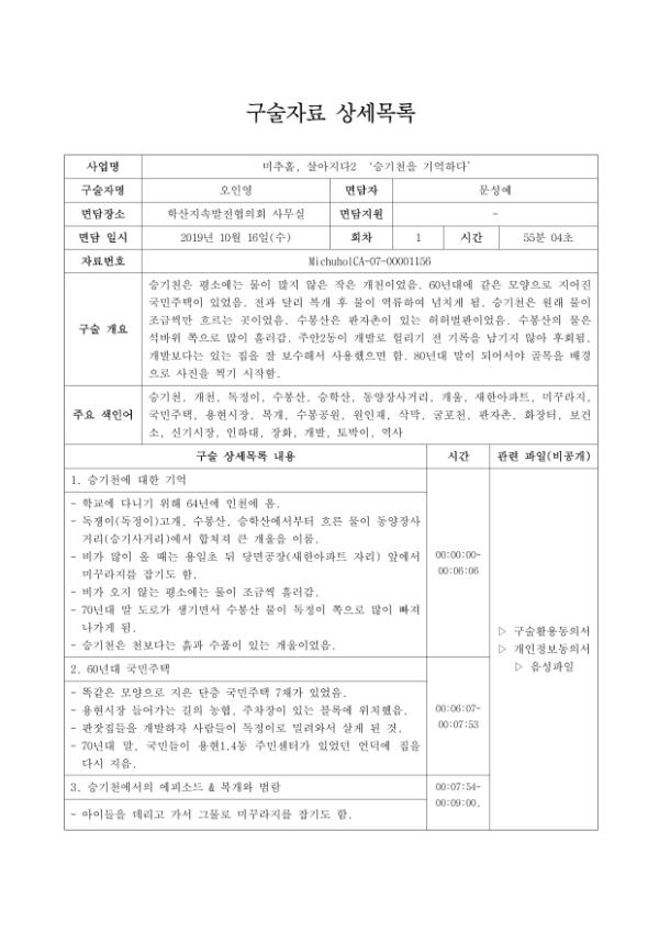 승기천을 개방을 한다고 오픈을 한다고 해놓으려는 거 아냐, 사람들이. 사람들이 지금 승기천을 청계천마냥 개방을 한다. 그러면 물을 끌고 와야 돼, 또 그렇잖아. 물을 끌고 와서 여기 와서 수봉공원부터 내려보내야지. 그렇게 되는 과정인데 그게 쉽냐고. 조금씩 흐른 거야. 그것밖에 없었지. 비가 오고. 그걸 갖다가 자꾸 지금 범람한다는 것은 옛날같이 팍 터놓았으면 그냥 쭉 빠져내려 갈텐데 지금은 메워가지고 맨홀로 해서 이렇게 뚫어서 했으니까 역순환이 된 거고, 넘치고 그러는 거지 진짜 그정도의 개천이었으면 그냥 큰 강이 흘렀으면 그것을 피해서 집을 이렇게 짓거나 그랬을 텐데 그런 개념도 아니었으니까. 진짜 당연히 이렇게 묻고 길을 만들거나 집을 지을 생각을 나라도 했을 것 같은데.