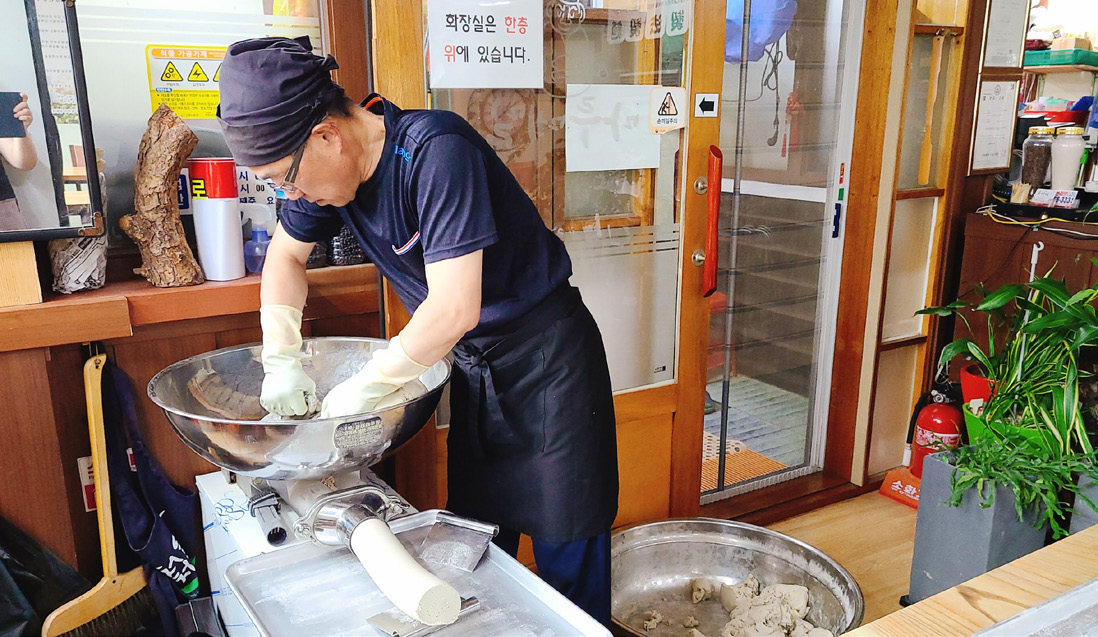 100% 메밀을 한다는 게 우리나라 기술은 사실 안 됐으니까. 근데 그게 이제 5년이라는 세월이 넘다 보니까 인정해 주는 사람들도 많고, 건강식으로 믿고 찾는 분들이 많아졌기 때문이죠. 그렇게 찰지게 반죽이 안 된다는 생각을 다 하니까요. 메밀은 그 글루텐이라는 성분이 없고, 밀가루에는 있어요. 그러면 찰기가 없다는 거예요. 찰기가 없으니까 반죽이 안 되는 거야. 근데 그거를 한 게 제가 일본 사람들을 좋아해서가 아니라 일본 사람들이 이걸 가지고 굉장히 연구를 많이 했어요. 그러니까 저 반죽기 자체가 우리나라에는 없어요. 그래서 저거를 일본에서 수입을 해 온 거야. 6년 전에 비싸니까 부산으로 배 타고 와가지고. 부산에서 화물차로 해서 여기까지 오는데, 그때 아마 한 8천만 원 정도 들었던 것 같아요. 기곗값만.