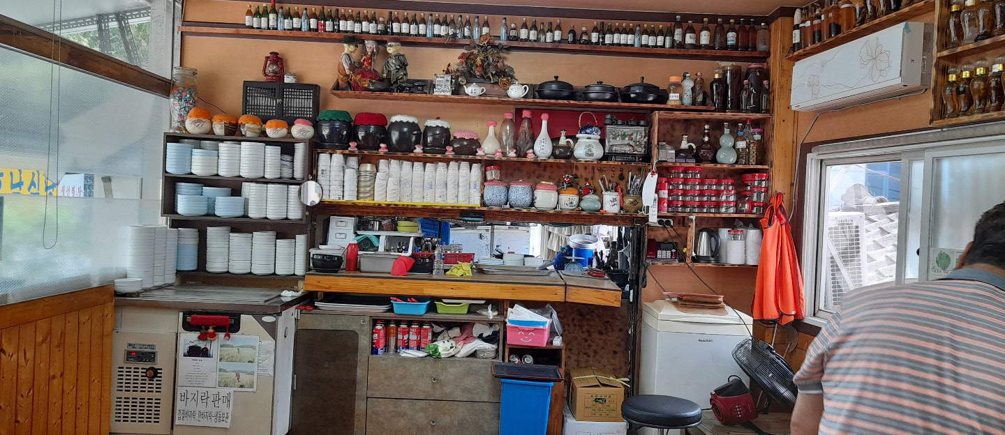 (장경엽) 계절별로 달라지는 건데. 제철 음식 있잖아요. 봄 같은 때는 나물 종류가 있죠. 내가 잡아다가 많이 쓰는 편이야. 나물도 봄 되면은 냉이 같은 거 캐서 만들고. 여기 보면 알겠지만, 바다 나가려고 호미를 많이 준비해 놨잖아요. 인터뷰하러 오셨는데 주방에서 못 나간 이유가 고동(갱)이 건조돼 버리면 안 빠져요. 그래서 내가 얼른 까야 되니까. 이런 거 잡아 와 가지고 쓰다 보면 사실 이런 고생 안 해도 뭐 마트 같은 데 가면 수입 고동도 있고 우렁이도 있고 막 그러잖아요. 그런 거 사용할 수 있어요. 그런데 내가 싫으니까 어쩔 수 없어요.