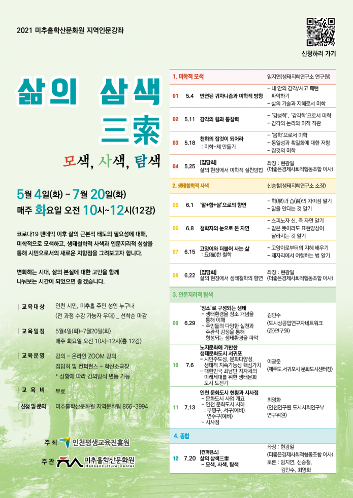 코로나19 팬데믹 이후 삶의 근복적 태도의 필요성에 대해, 미학적으로 모색하고, 생태철학적 사색과 인문지리적 성찰을 통해 시민으로서의 새로운 지향점을 그려보고자 합니다.