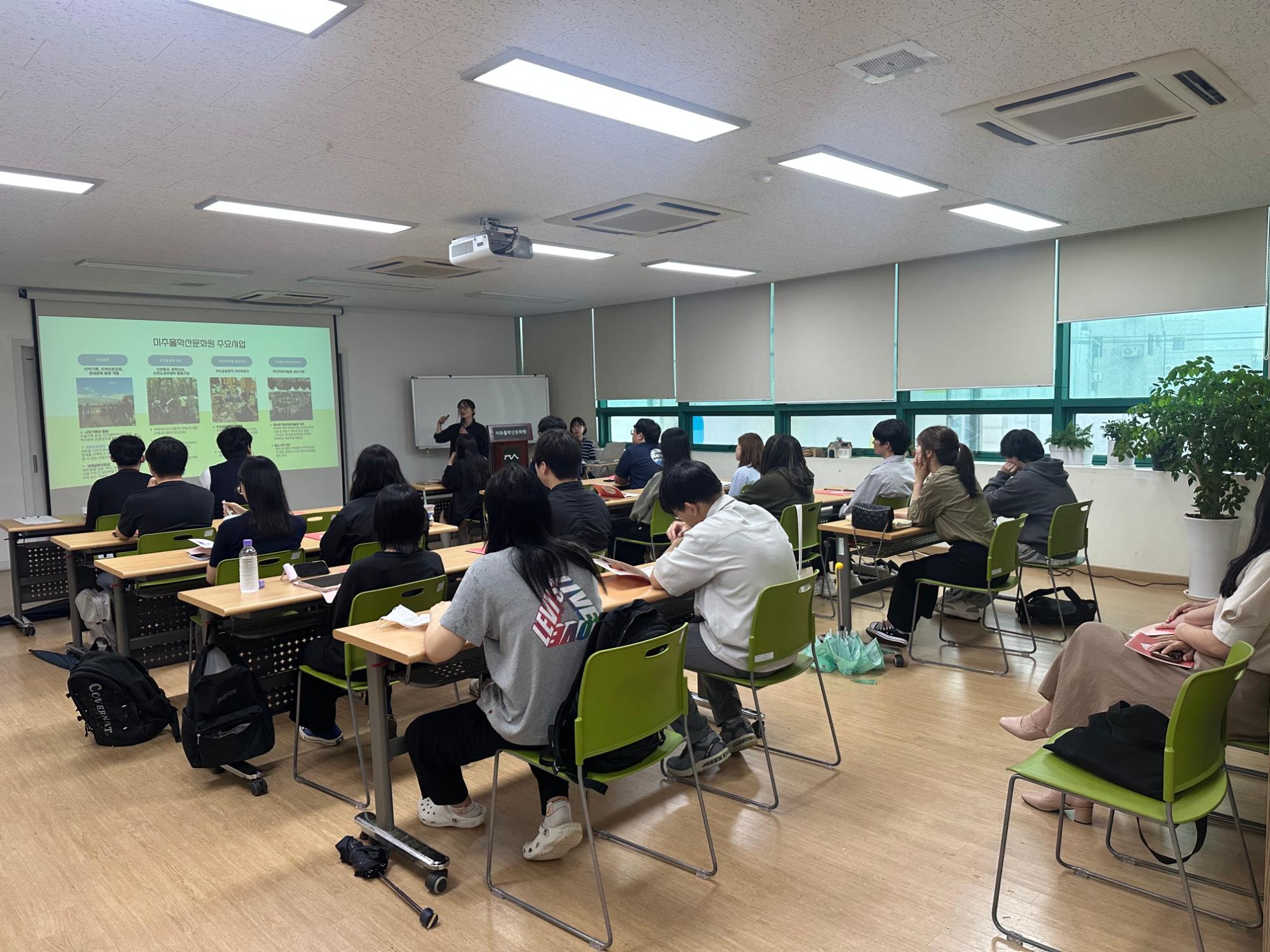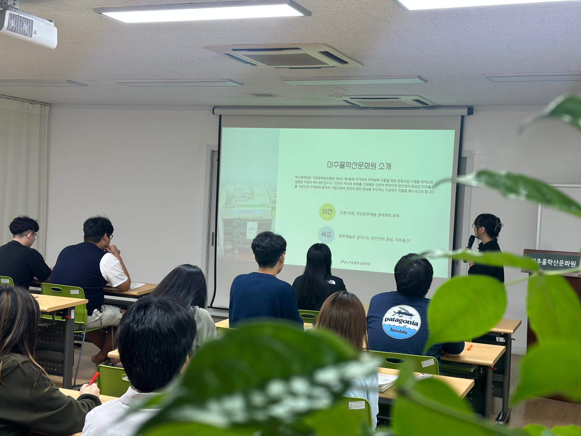 미추홀학산문화원이 인하대학교 프런티어 학부과 협약을 통해 2023년 2학기 '세계시민성교육'강좌의 일부 과정을 공동기획, 운영하였다. 사진은 1차시인 '동양평화와 전환 사회의 인천'의 현장사진이다. 강의는 김현석 인천민속학회 이사가 맡았으며, 지역적 관점에서 시작하여 세계 시민성까지 확장하는 시선을 담은 강의가 진행되었다.