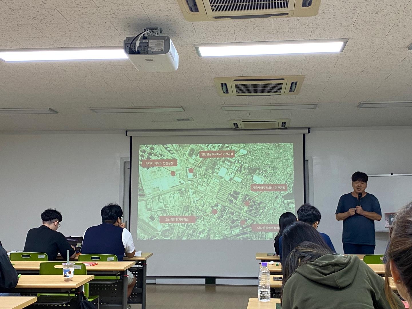 미추홀학산문화원이 인하대학교 프런티어 학부과 협약을 통해 2023년 2학기 '세계시민성교육'강좌의 일부 과정을 공동기획, 운영하였다. 사진은 1차시인 '동양평화와 전환 사회의 인천'의 현장사진이다. 강의는 김현석 인천민속학회 이사가 맡았으며, 지역적 관점에서 시작하여 세계 시민성까지 확장하는 시선을 담은 강의가 진행되었다.
