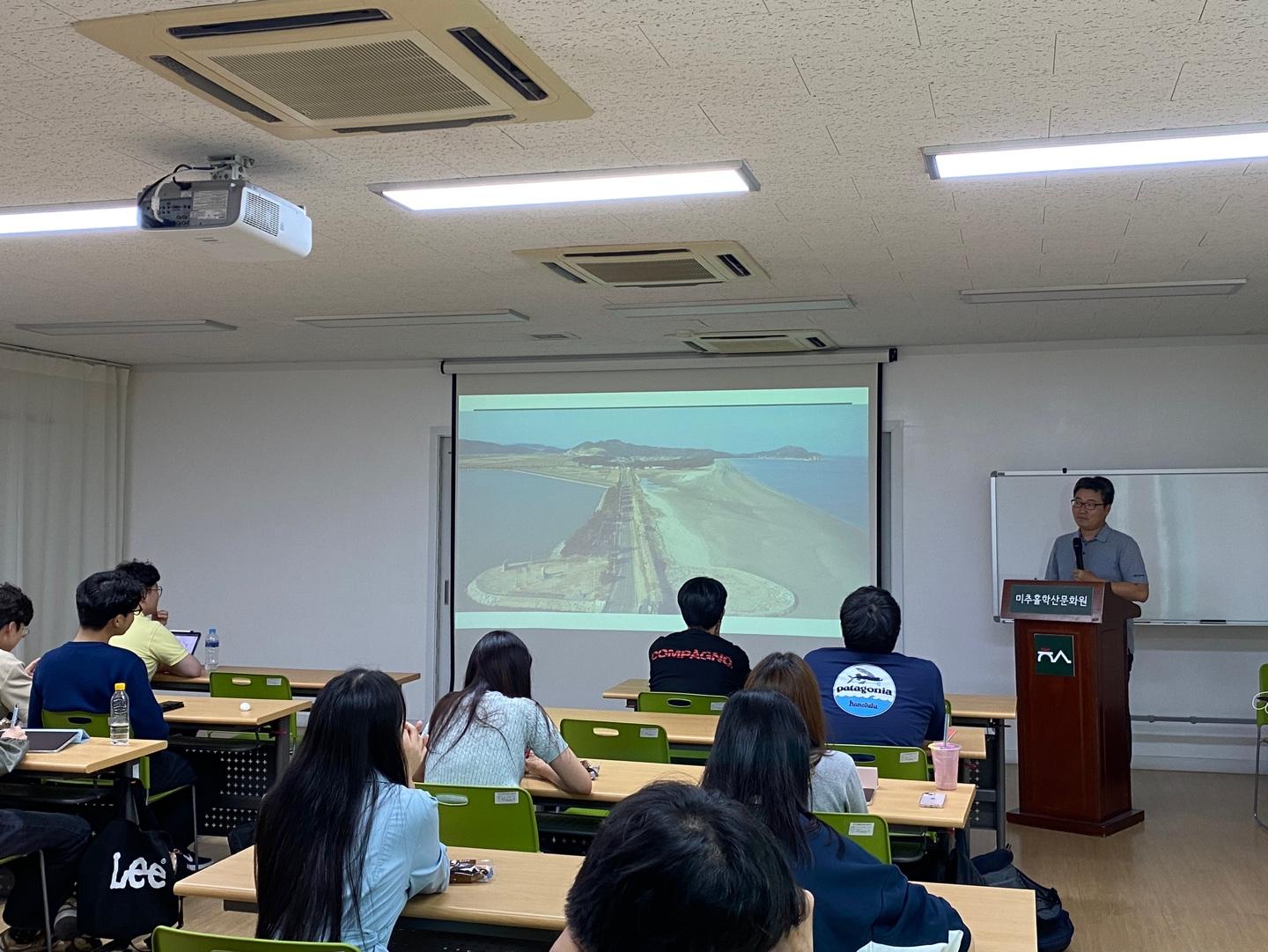 미추홀학산문화원이 인하대학교 프런티어 학부과 협약을 통해 2023년 2학기 '세계시민성교육'강좌의 일부 과정을 공동기획, 운영하였다. 사진은 강좌의 2차시 세계 시민성과 로컬사례의 일환으로 진행된 [한반도와 황해 그리고 인천_해양환경을 중심으로]의 현장사진이다. 강의는 장정구 (사)생태교육센터 이랑 공동대표가 맡았다.