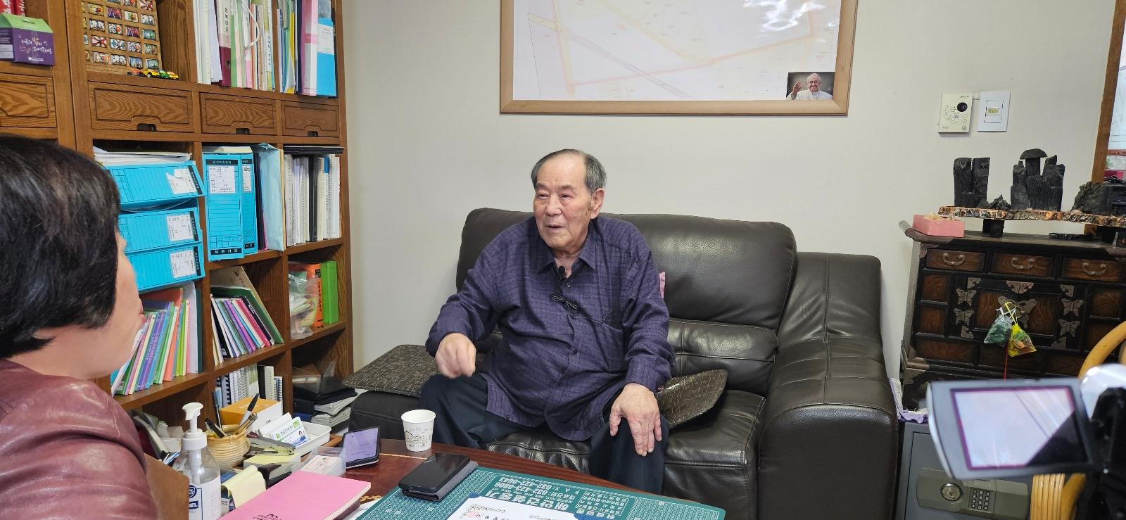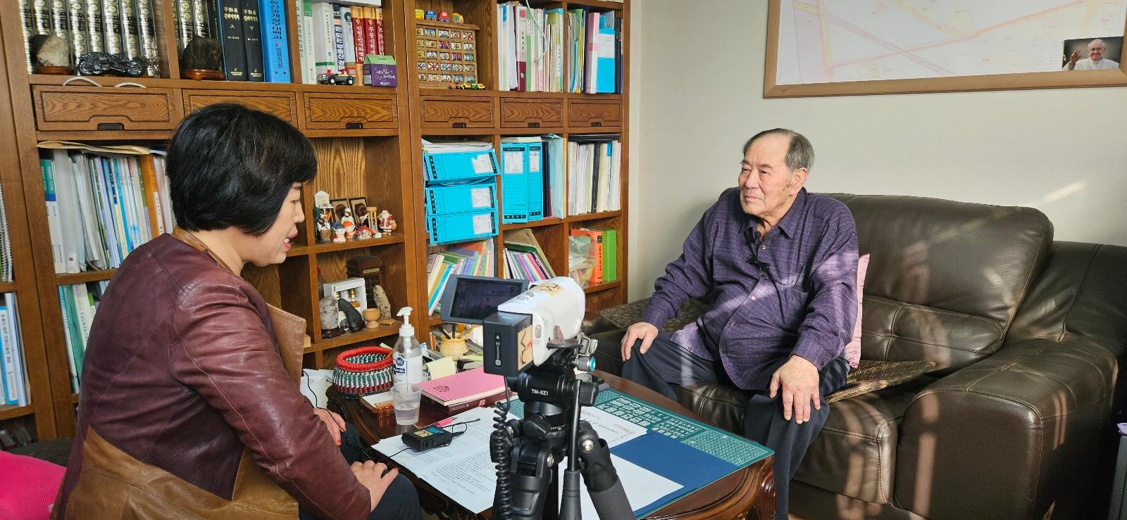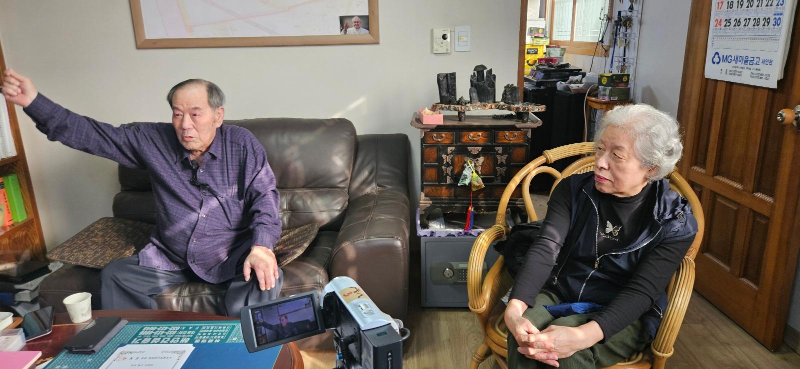 2024년 11월 13일 미추홀구에서 최초의 쫄면을 개발하게된 동기와 정돈시 구술자의 생애사에 대하여 구술채록 인터뷰를 하는 모습이다.