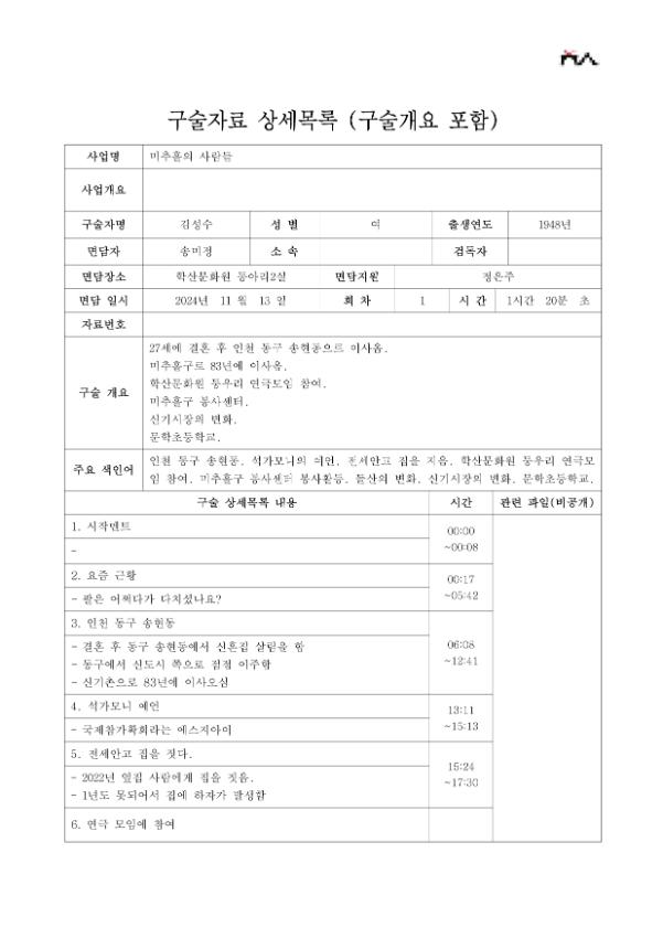 | 출처분류 | 미추홀학산문화원 사업 미추홀 기록 2024 미추홀시민기록단 구술기록 김성수 |