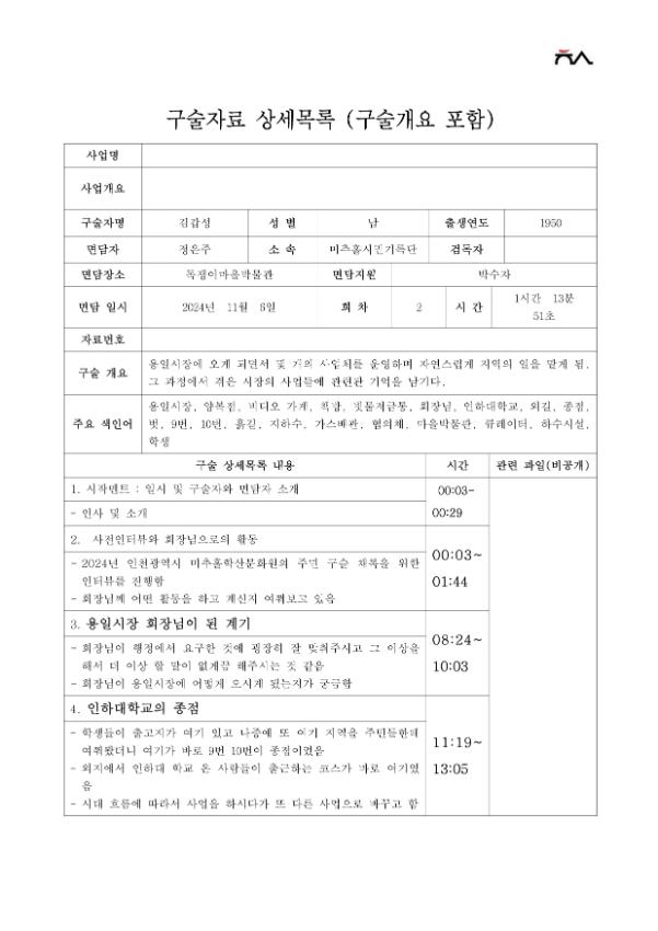 | 출처분류 | 미추홀학산문화원 사업 미추홀 기록 2024 미추홀시민기록단 구술기록 김갑성 |