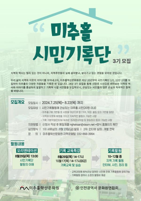 미추홀학산문화원이 2024년 7월25일부터 8월13일까지 미추홀시민기록단 3기를 모집하기 위한 포스터이다.