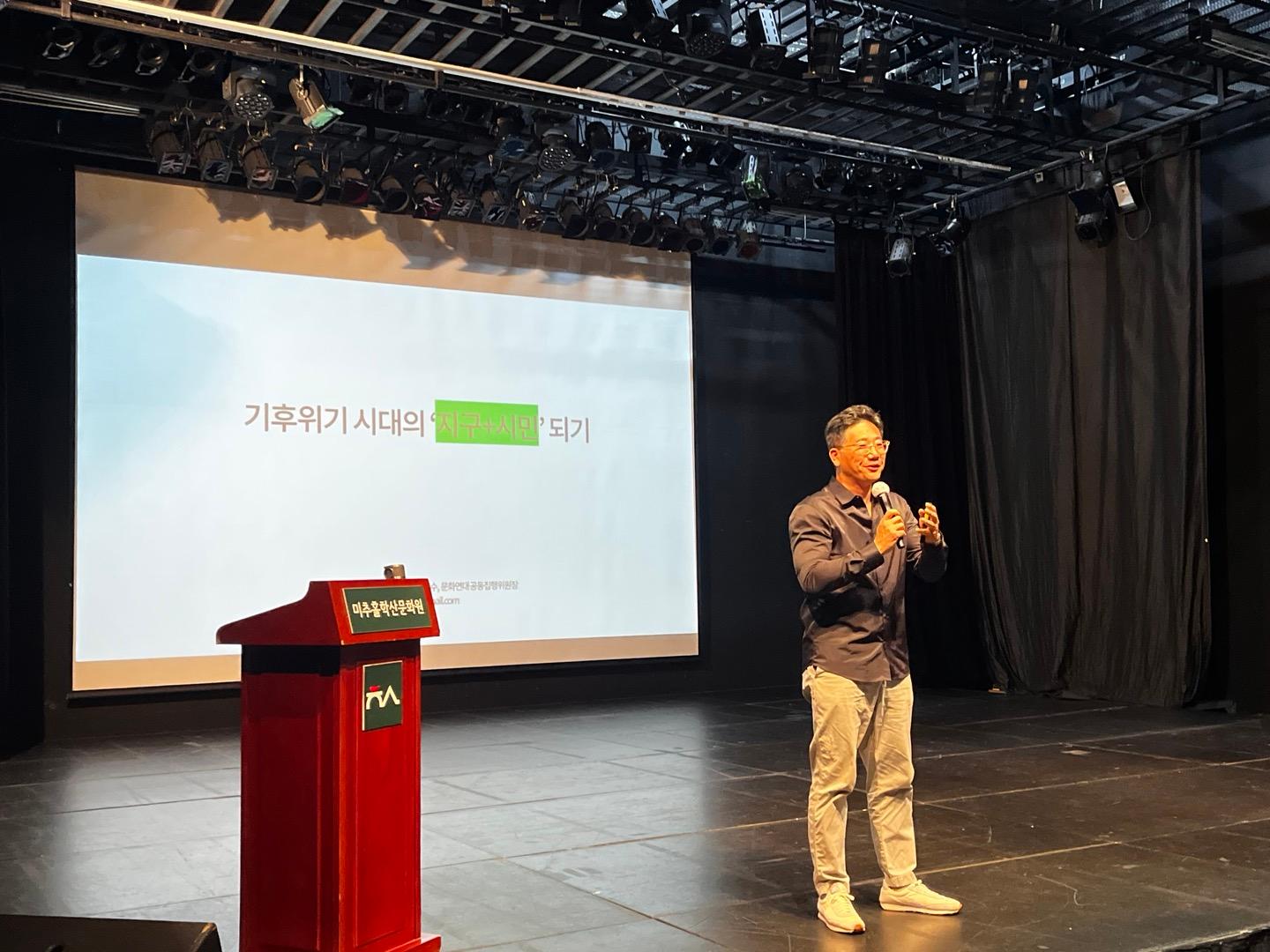 1강 [지금, 지구에서 '세계시민'이 된다는 것]의 현장 사진으로, 이원재 문화연대 상임위원장이 강의를 진행했습니다.