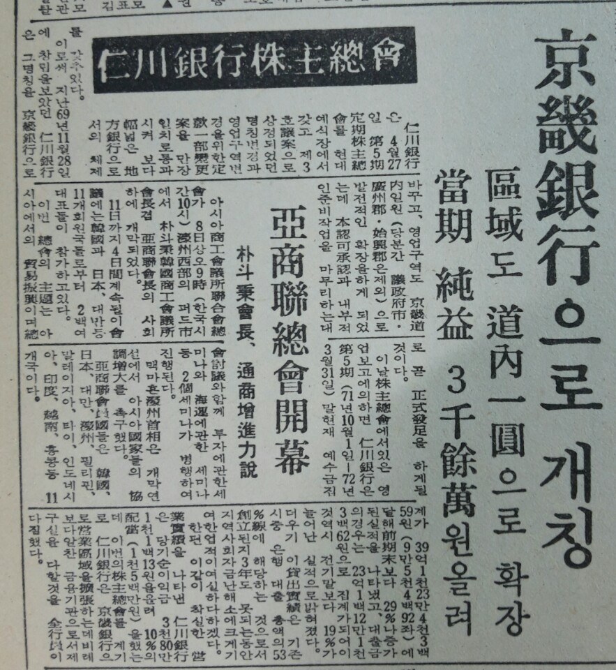 1972년 4월 27일 기사로 인천은행에서 경기은행으로 명칭 변경이 의결되었다는 신문 기사