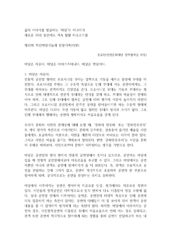 | 검색어 | 마당예술동아리,학산마당극놀래,시민창작예술,리뷰 |