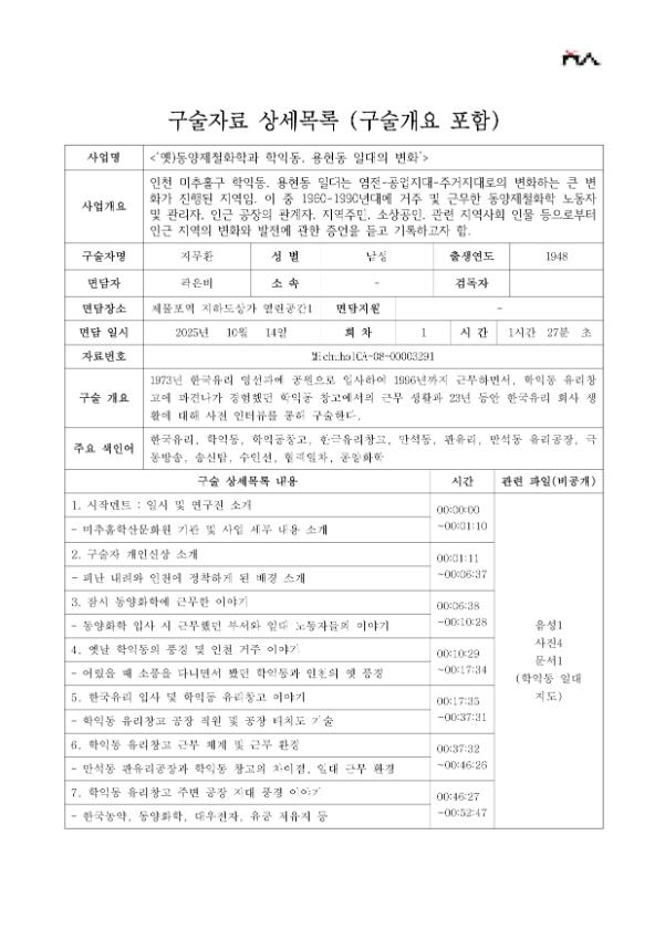 • 목    적 : 인천 미추홀구 학익동, 용현동 일대는 염전-공업지대-주거지대로의 변화하는 큰 변화가 진행된 지역임. 이 중 1960-1990년대에 거주 및 근무한 동양제철화학 노동자 및 관리자, 인근 공장의 관계자, 지역주민, 소상공인, 관련 지역사회 인물 등으로부터 인근 지역의 변화와 발전에 관한 증언을 듣고 기록하고자 함.