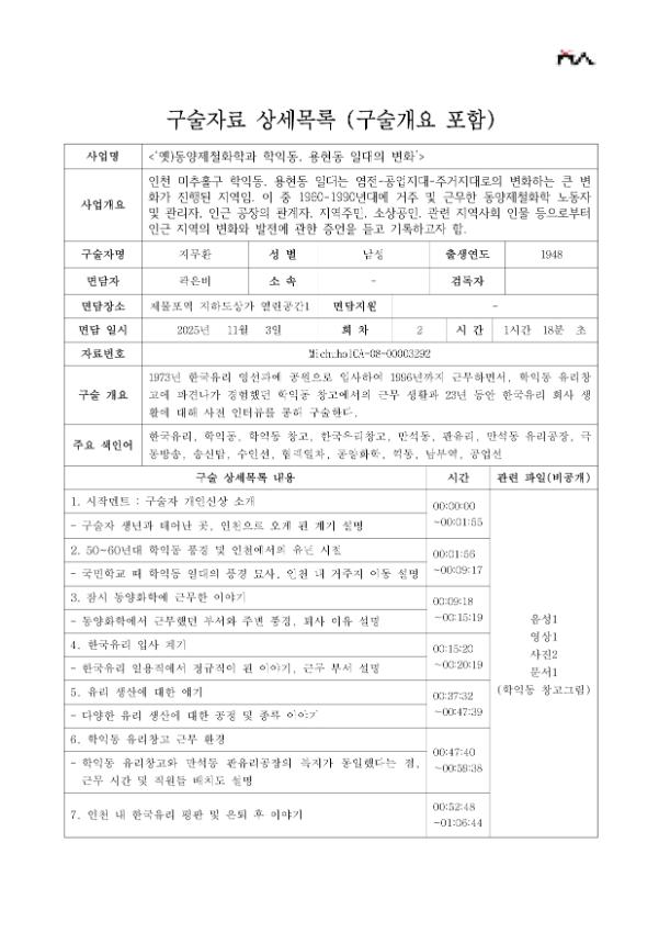 • 목 적 : 인천 미추홀구 학익동, 용현동 일대는 염전-공업지대-주거지대로의 변화하는 큰 변화가 진행된 지역임. 이 중 1960-1990년대에 거주 및 근무한 동양제철화학 노동자 및 관리자, 인근 공장의 관계자, 지역주민, 소상공인, 관련 지역사회 인물 등으로부터 인근 지역의 변화와 발전에 관한 증언을 듣고 기록하고자 함.